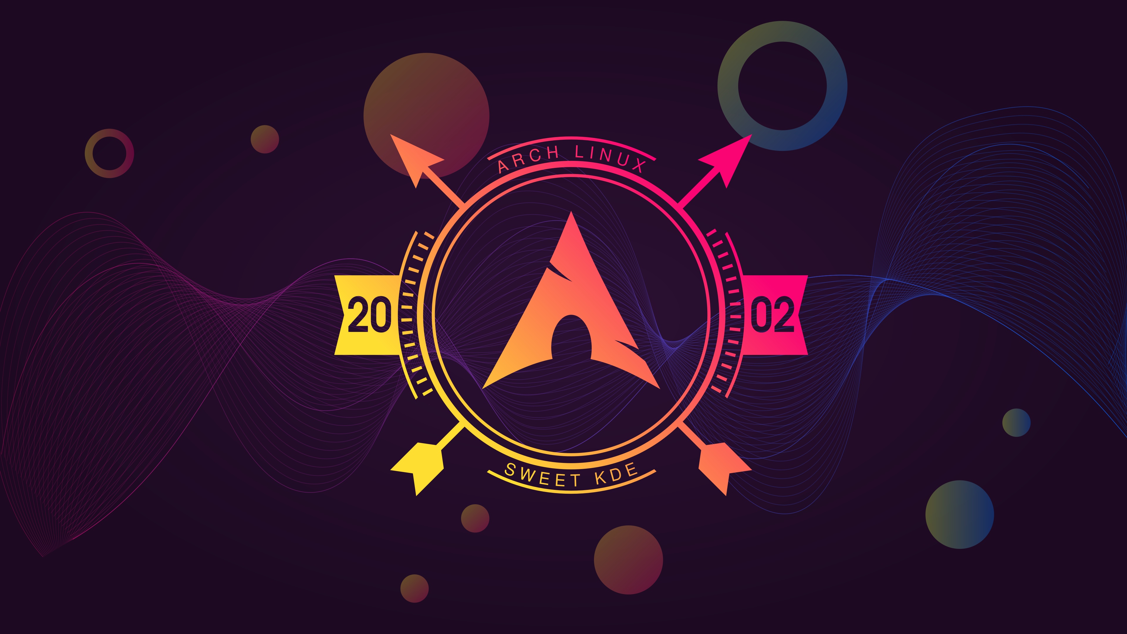 Зашеметяващ 4K тапет за Arch Linux с емблематичното лого и тема Sweet KDE. Тъмнолилав фон с ярки градиентни стрелки, светещи вълни и геометрични форми. Перфектен за любители на Linux и персонализиране на работния плот.