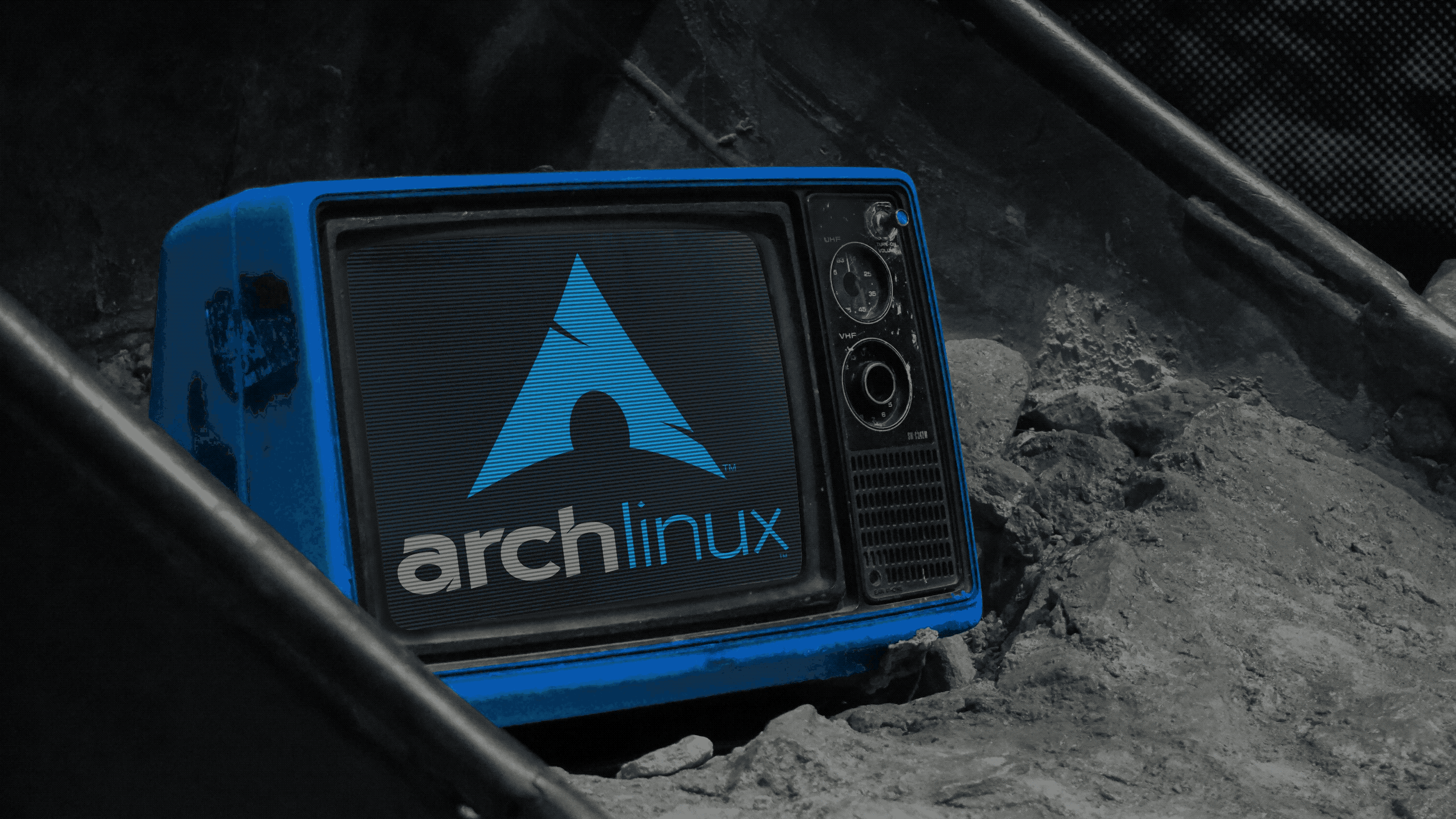 荒涼とした埃っぽい荒廃地に放置された、象徴的なArch Linuxロゴを表示する風化した青いレトロCRTテレビ。Linux愛好家やテクノロジー好きに最適な高解像度壁紙。
