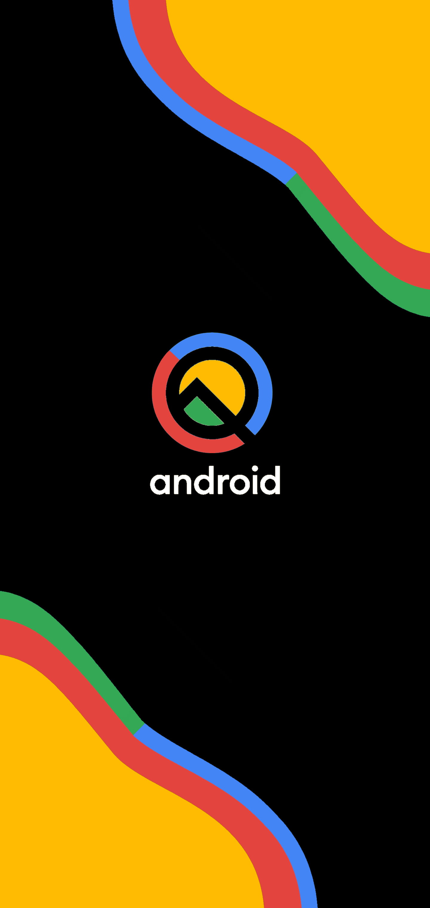 Stunning high-resolution Android Q wallpaper featuring the iconic multicolored logo on a deep black background with vibrant yellow, red, blue, and green wave accents. Perfect for Android enthusiasts.