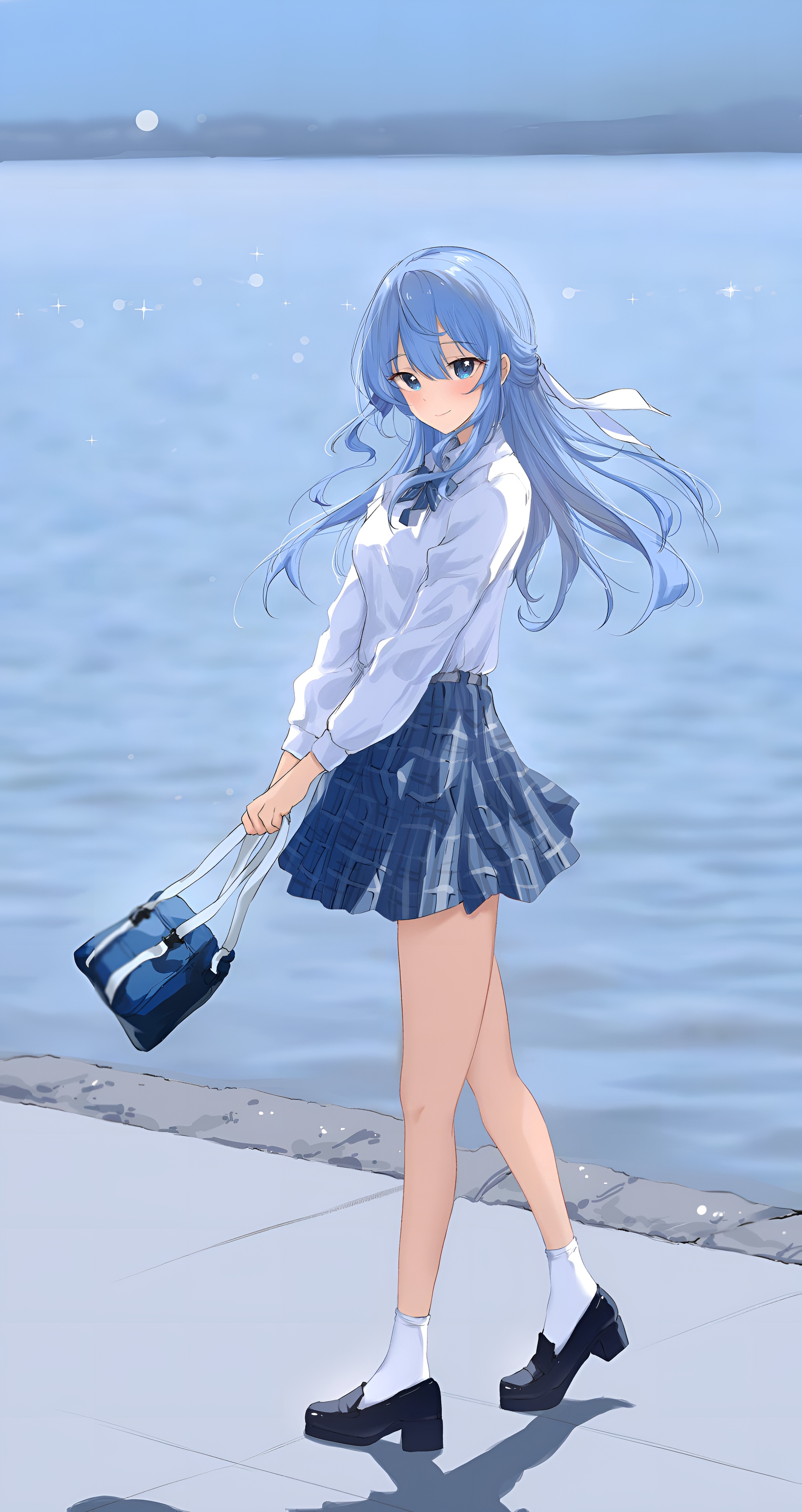 A stunning anime girl with flowing blue hair walks along a serene oceanside path. Dressed in a school uniform with a plaid skirt, she carries a blue bag, radiating elegance and tranquility.