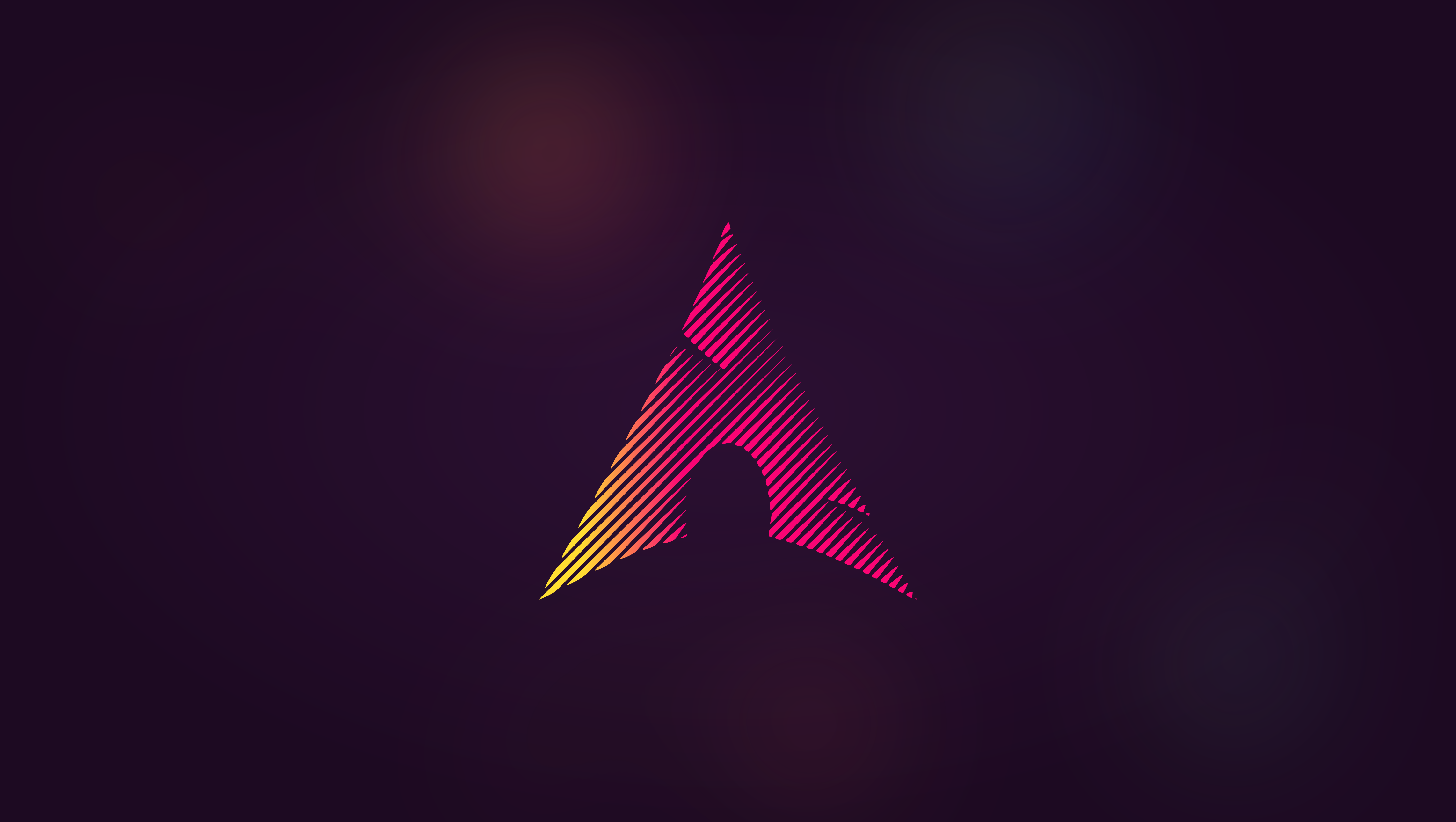 A stunning 4K high-resolution Arch Linux wallpaper featuring the iconic logo rendered in vibrant pink, magenta, and yellow gradient diagonal lines against a deep dark purple background with subtle light effects.