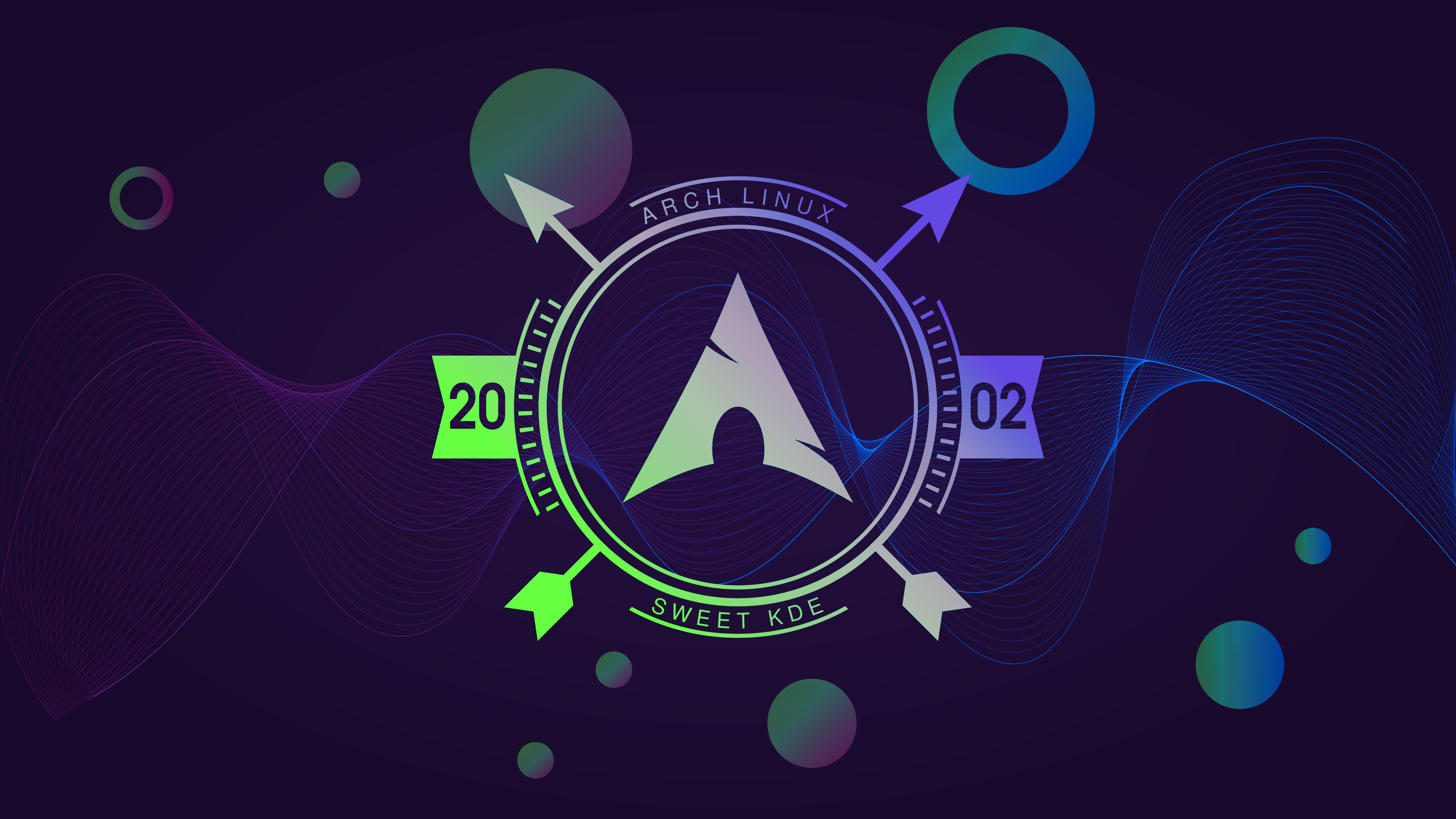 Premium 4K ultra HD Arch Linux Sweet KDE wallpaper featuring the iconic Arch logo with dynamic purple-blue gradients, flowing waves, and geometric elements. Perfect high-resolution desktop background for modern Linux setups and KDE Plasma environments.