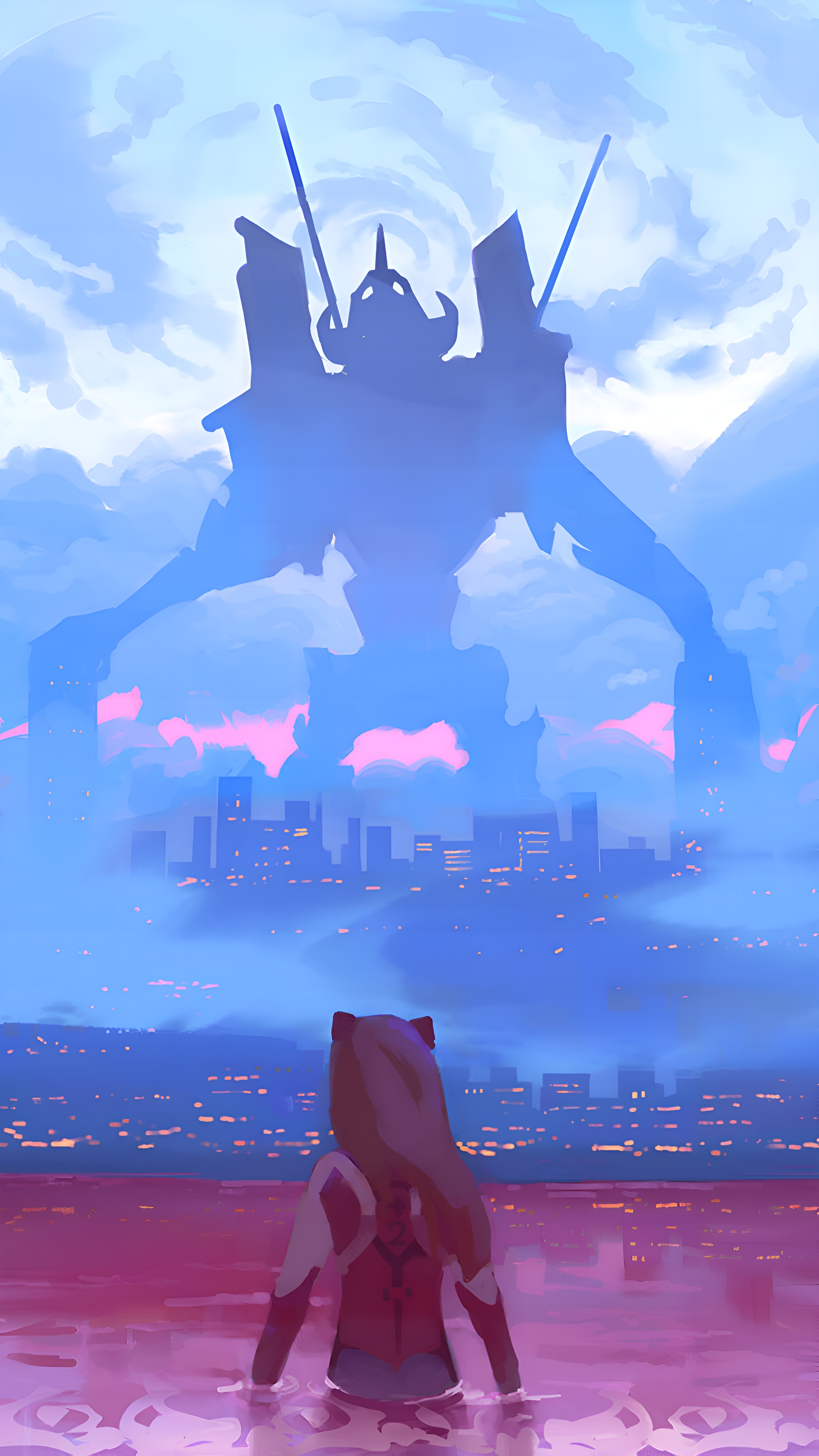 Stunning Neon Genesis Evangelion fan art wallpaper featuring Asuka standing before a massive EVA unit silhouette over a glowing cityscape. Painted in dreamy blue and pink tones, perfect for phone screens.