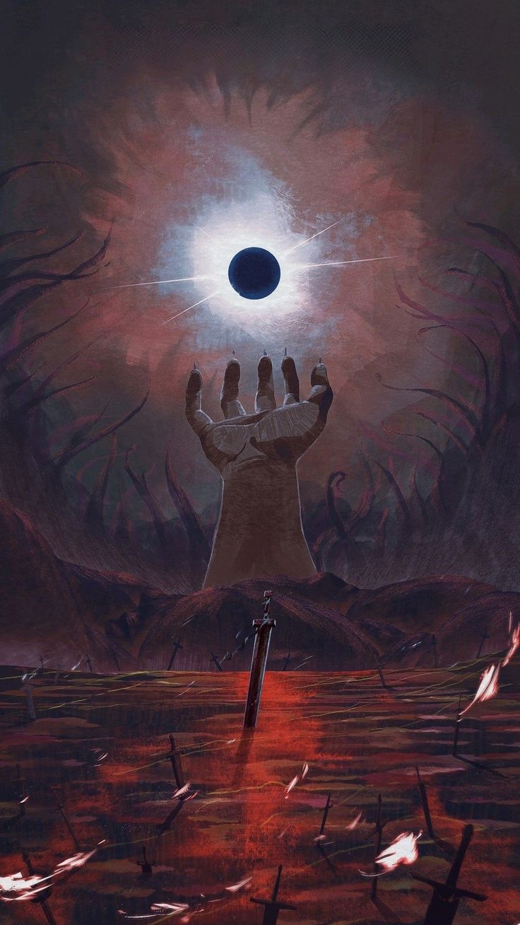 Epic dark fantasy mobile wallpaper featuring a colossal hand reaching toward an eclipsed sun above a blood-soaked battlefield littered with swords. Inspired by Berserk's iconic Eclipse scene, this high-resolution artwork captures the apocalyptic atmosphere with dramatic lighting and ominous crimson tones perfect for anime fans.