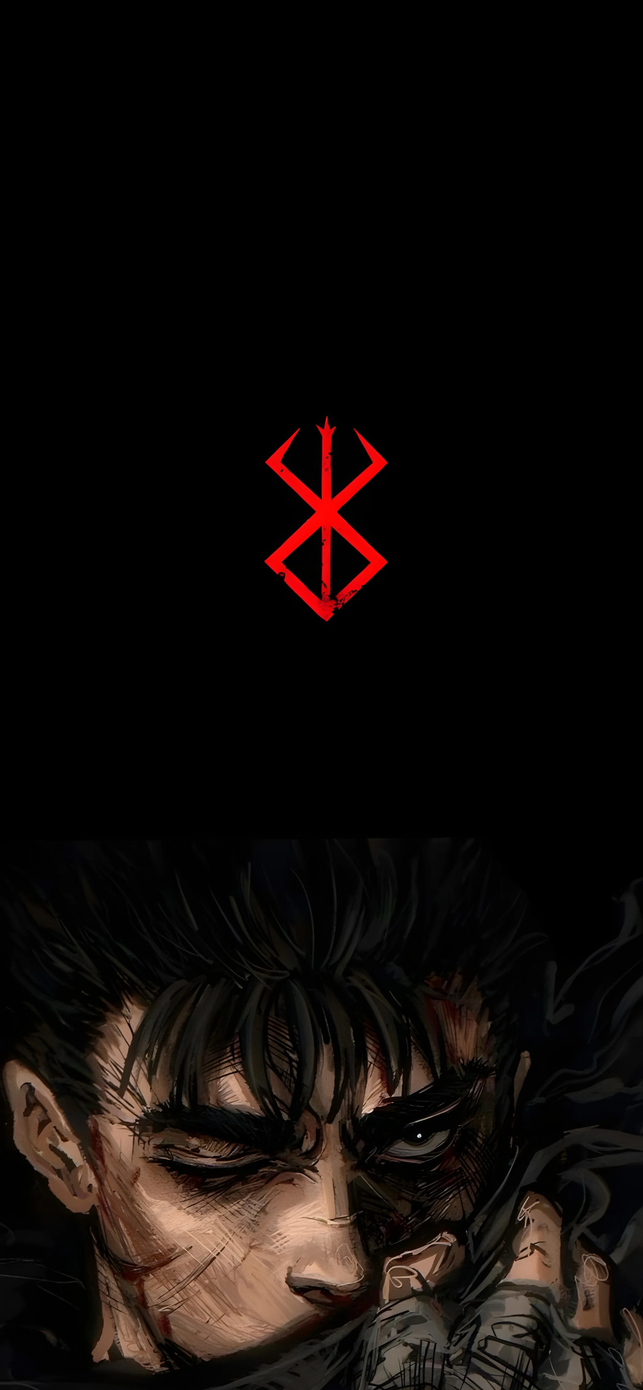 A stunning 4K dark wallpaper featuring Guts from Berserk, with the iconic red Brand of Sacrifice symbol. Dramatic lighting highlights battle scars and intense expression, perfect for fans of the legendary dark fantasy manga.