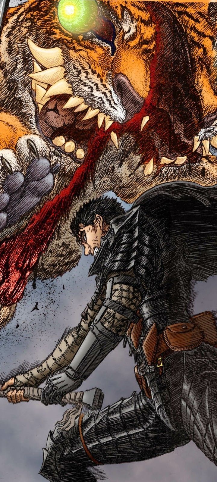 Guts, the Black Swordsman, confronts a massive tiger-like beast in this stunning Berserk manga art. Clad in his iconic Berserker Armor, he stands fearlessly against the monstrous creature in breathtaking detail.