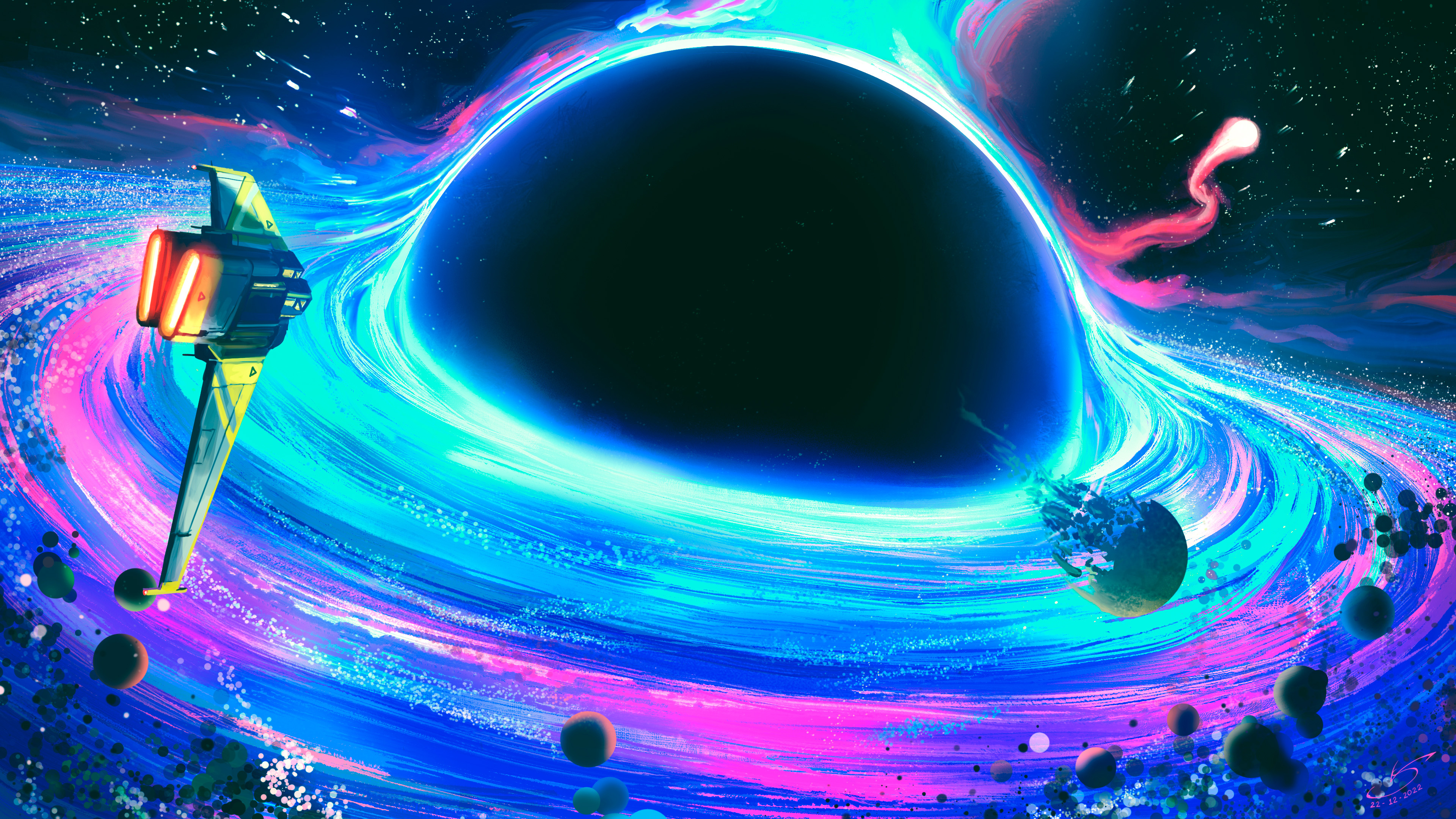 black hole wallpaper, 4K space art, neon galaxy wallpaper, sci-fi spaceship, accretion disk, high resolution space wallpaper, cyberpunk space, digital art cosmos, ultra HD wallpaper, futuristic space illustration