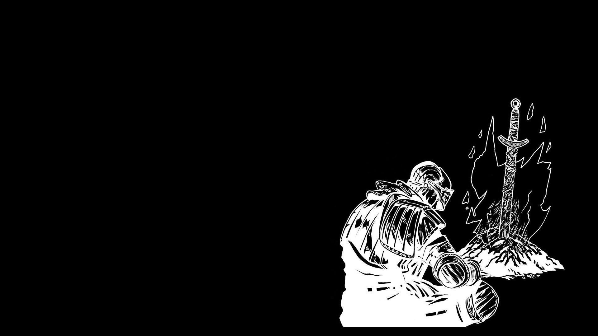 A stunning black and white minimalist illustration of a weary Dark Souls knight kneeling beside a bonfire with a sword planted in the ground. Perfect high-resolution wallpaper for fans of the iconic game.