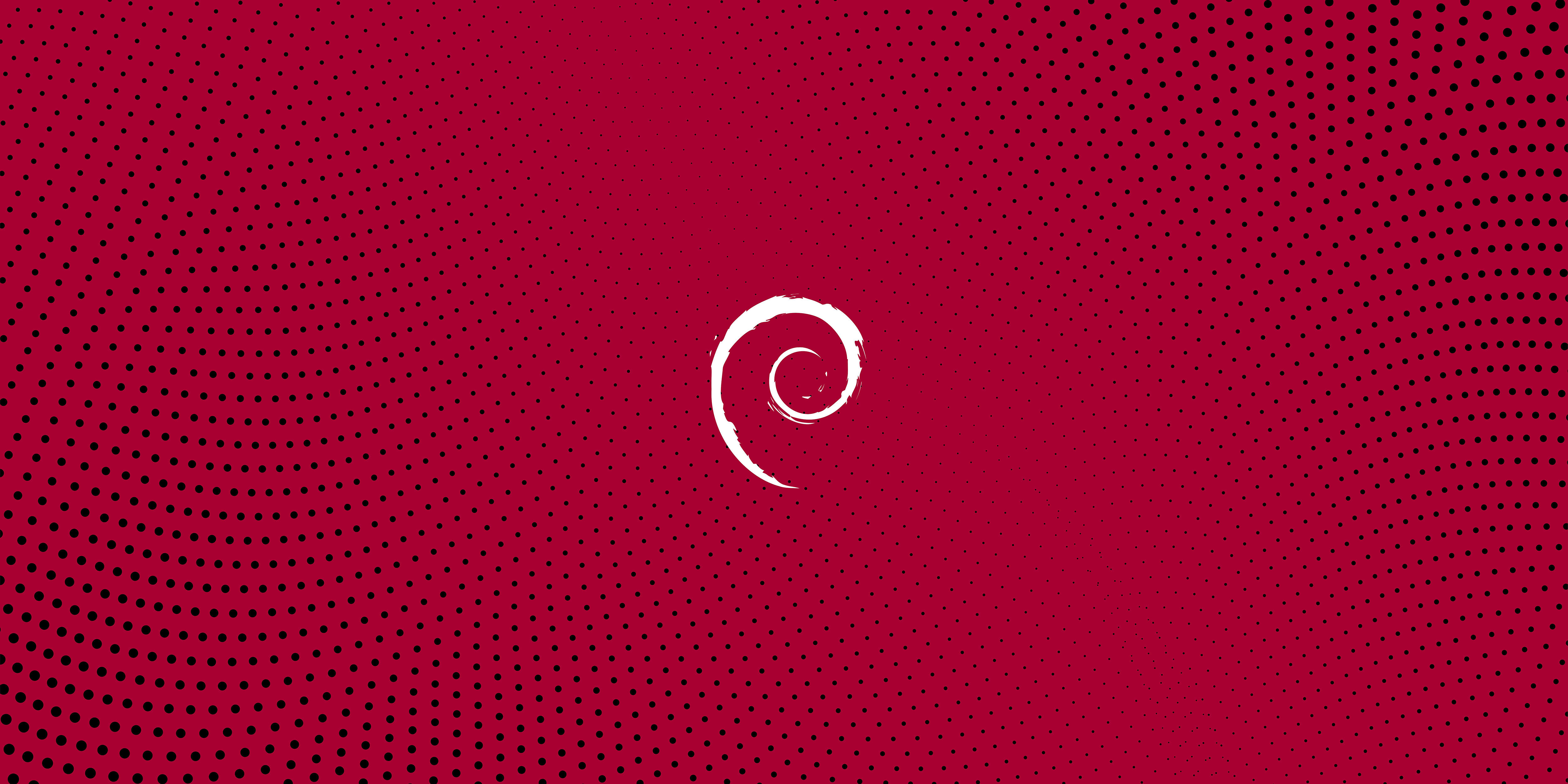 Stunning high-resolution Debian Linux wallpaper featuring the iconic white spiral logo on a vibrant red background with halftone dot pattern. Perfect for Debian enthusiasts and Linux users seeking a modern, eye-catching desktop background that celebrates open-source computing.