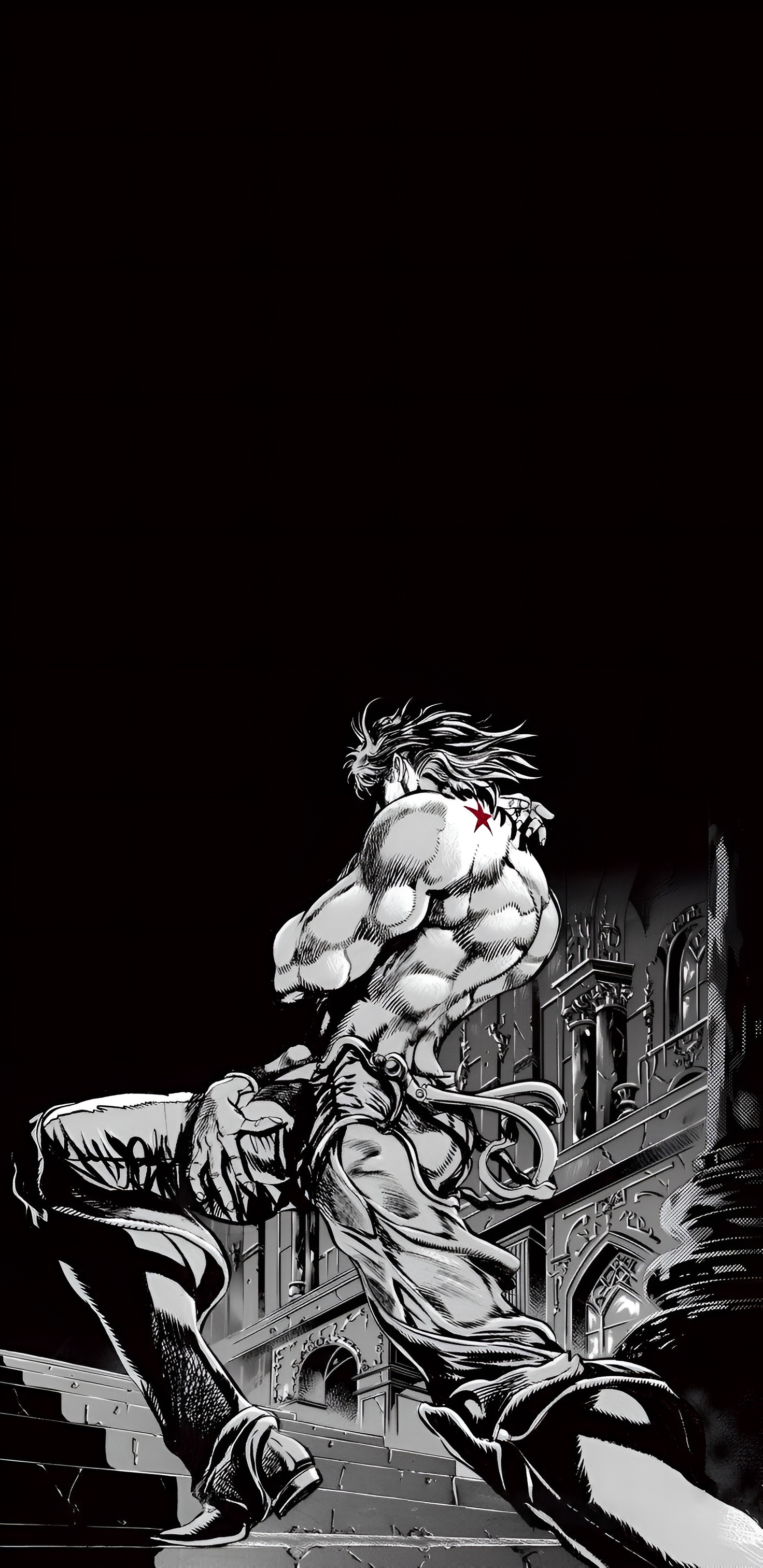 Stunning 4K high-resolution wallpaper featuring DIO from JoJo's Bizarre Adventure in a dramatic black and white manga art style, showcasing his muscular form with a red star mark against a dark gothic backdrop.