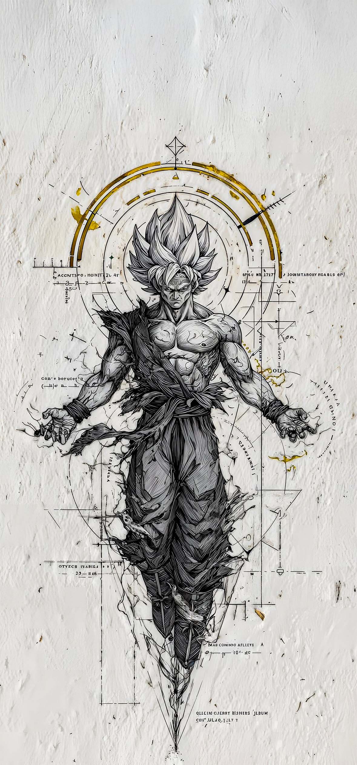 Stunning 4K high-resolution Dragon Ball wallpaper featuring a Super Saiyan warrior in a detailed blueprint-style sketch with golden geometric elements, sacred geometry, and technical annotations on textured white background.