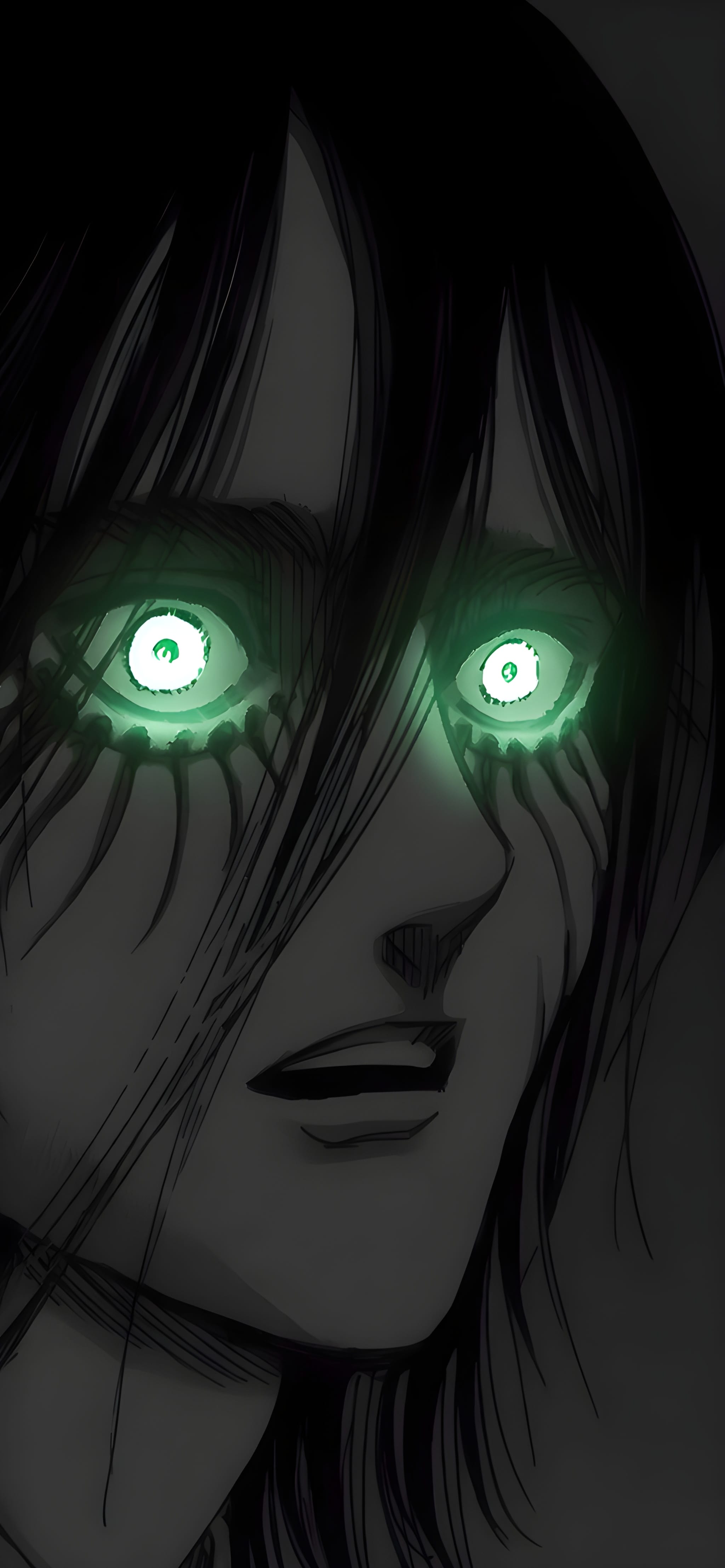 A stunning 4K high-resolution Attack on Titan wallpaper featuring Eren Yeager with intensely glowing green eyes in a dark, dramatic art style. Perfect for anime fans seeking an ultra-HD phone wallpaper.