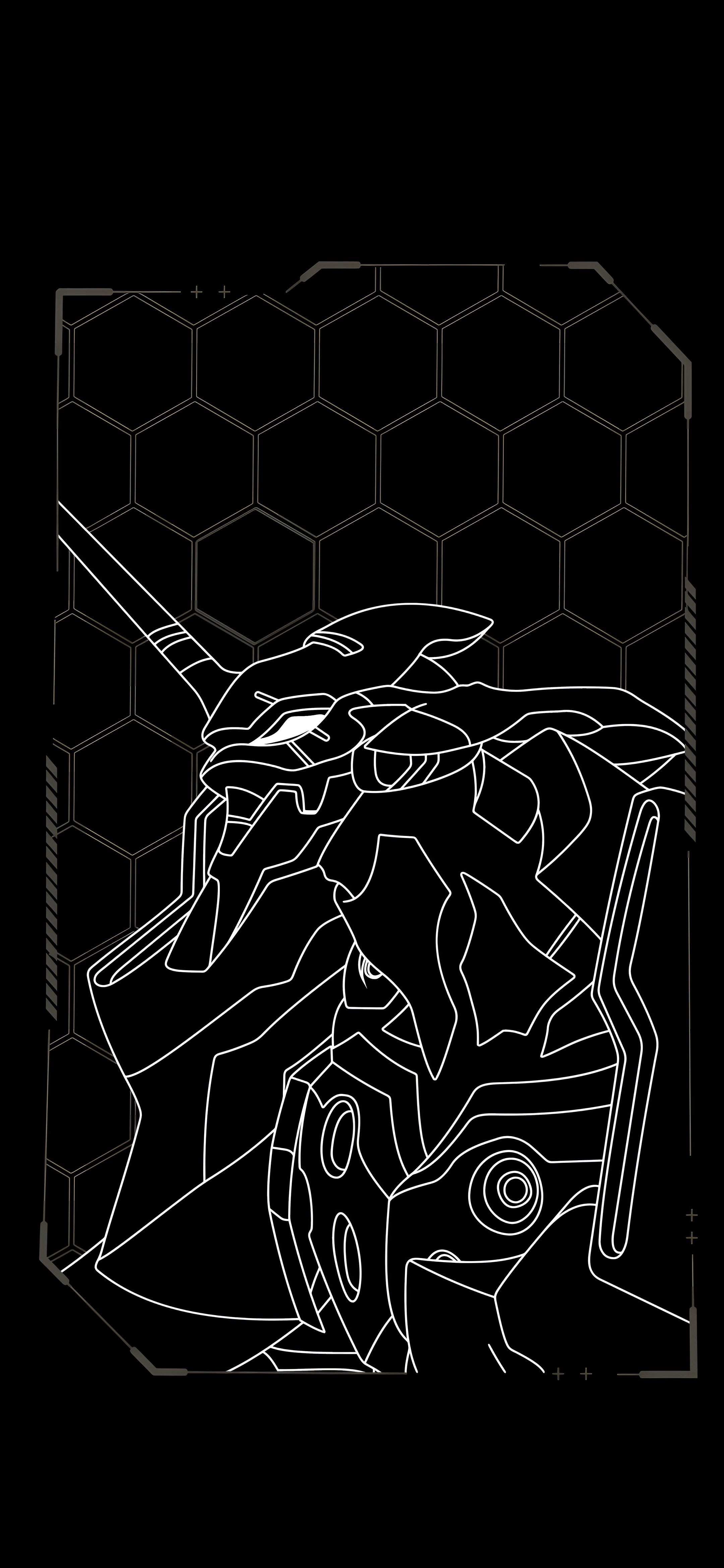 Stunning minimalist line art wallpaper of Evangelion Unit-01 from Neon Genesis Evangelion, rendered in white outlines on a black background with a hexagonal grid pattern, perfect for AMOLED displays.