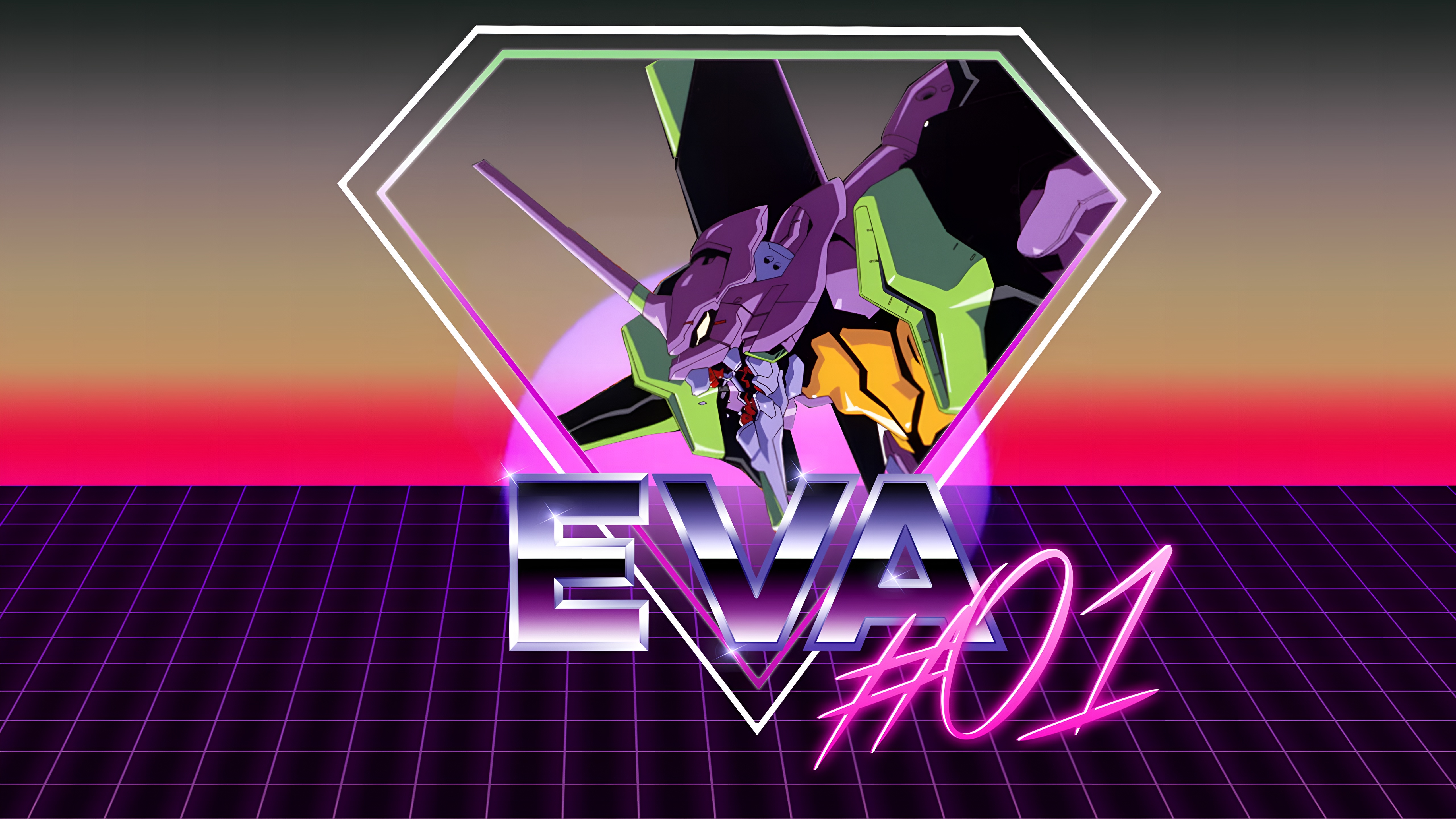 Stunning 4K high-resolution wallpaper featuring EVA Unit 01 from Neon Genesis Evangelion in a bold retrowave synthwave aesthetic, combining neon grids, vibrant gradients, and iconic mecha design for the ultimate anime fan desktop.