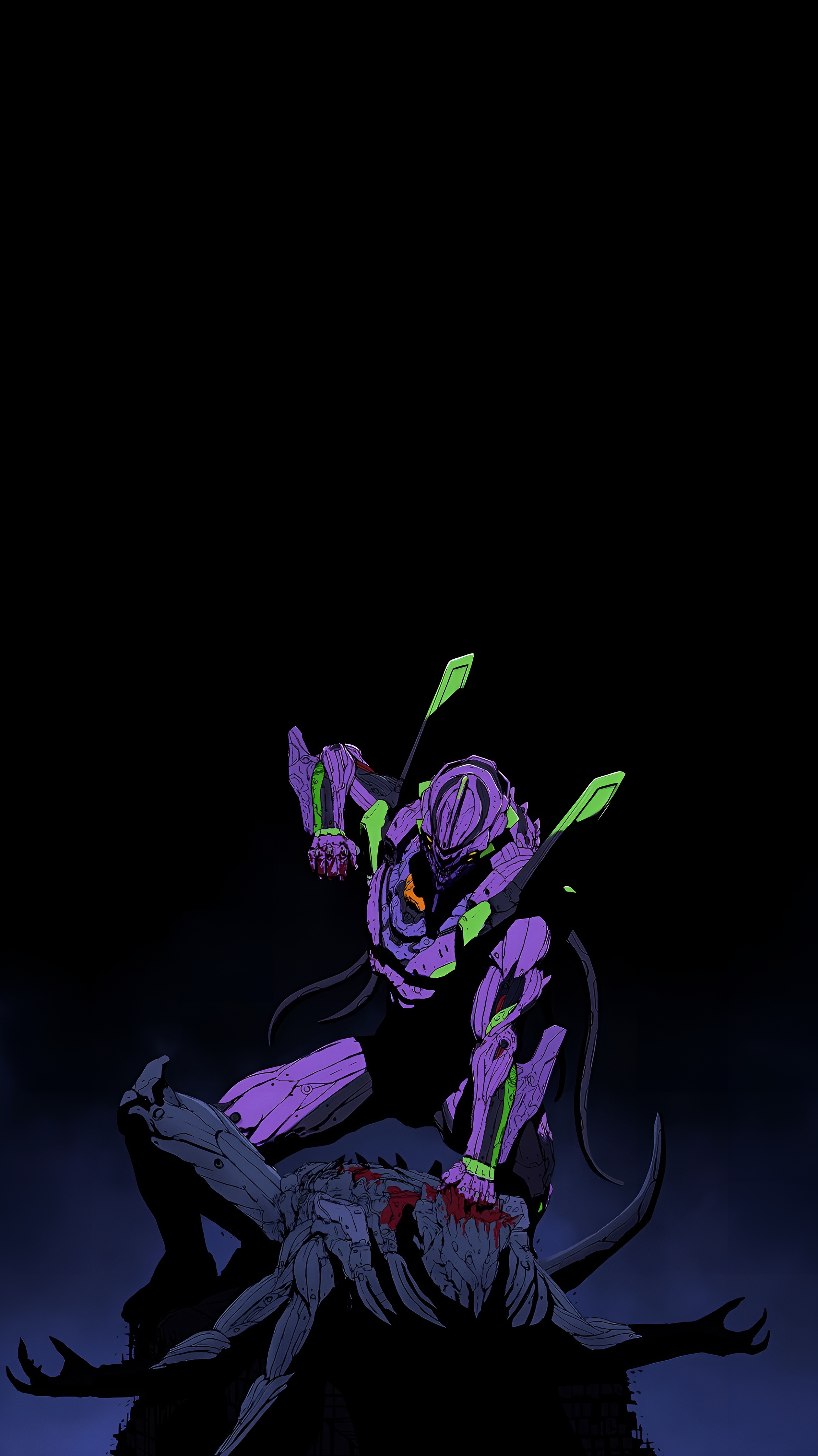 Stunning 4K phone wallpaper featuring EVA Unit-01 from Neon Genesis Evangelion in its iconic purple and green design, dominating a dark background in a powerful combat pose against a defeated Angel.