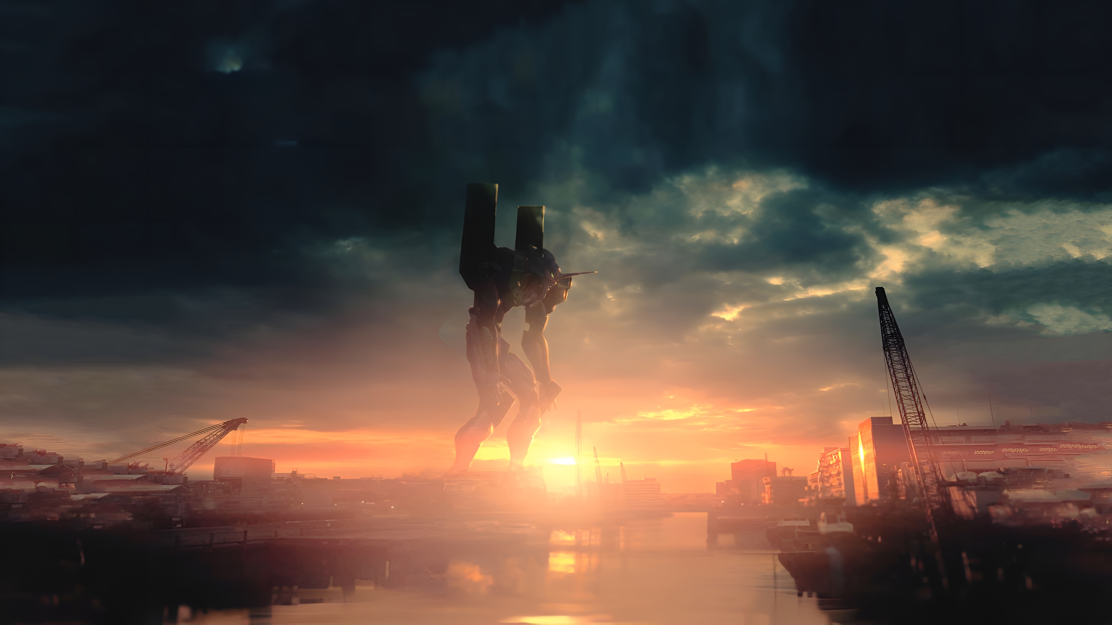 Neon Genesis Evangelion wallpaper, EVA 01 wallpaper, EVA Unit-01 silhouette, 4K anime wallpaper, mecha sunset cityscape, Evangelion 4K HD, anime sci-fi wallpaper, giant robot sunset, high resolution Evangelion, cinematic mecha art
