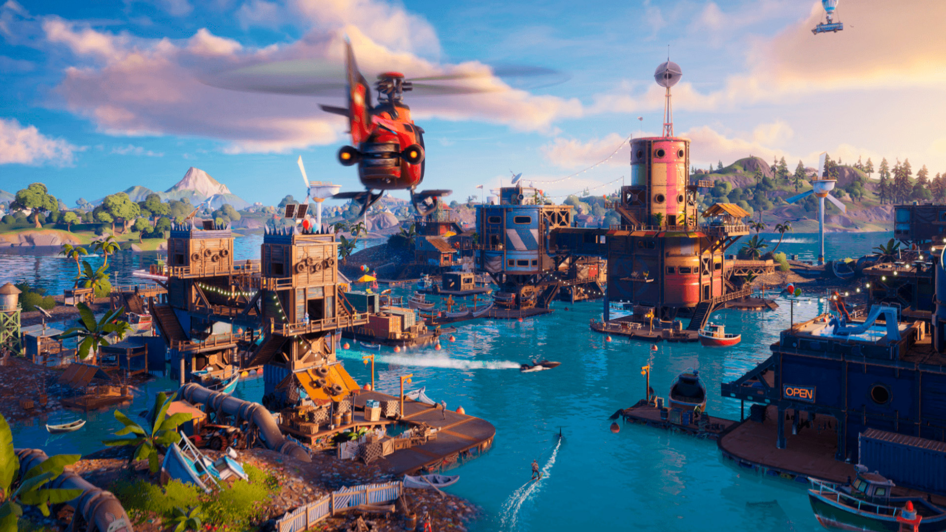 Stunning 4K Fortnite wallpaper featuring a vibrant harbor settlement with rustic multi-level structures, a red helicopter, turquoise waters, and boats. Perfect high-resolution desktop background capturing Fortnite's iconic colorful art style.
