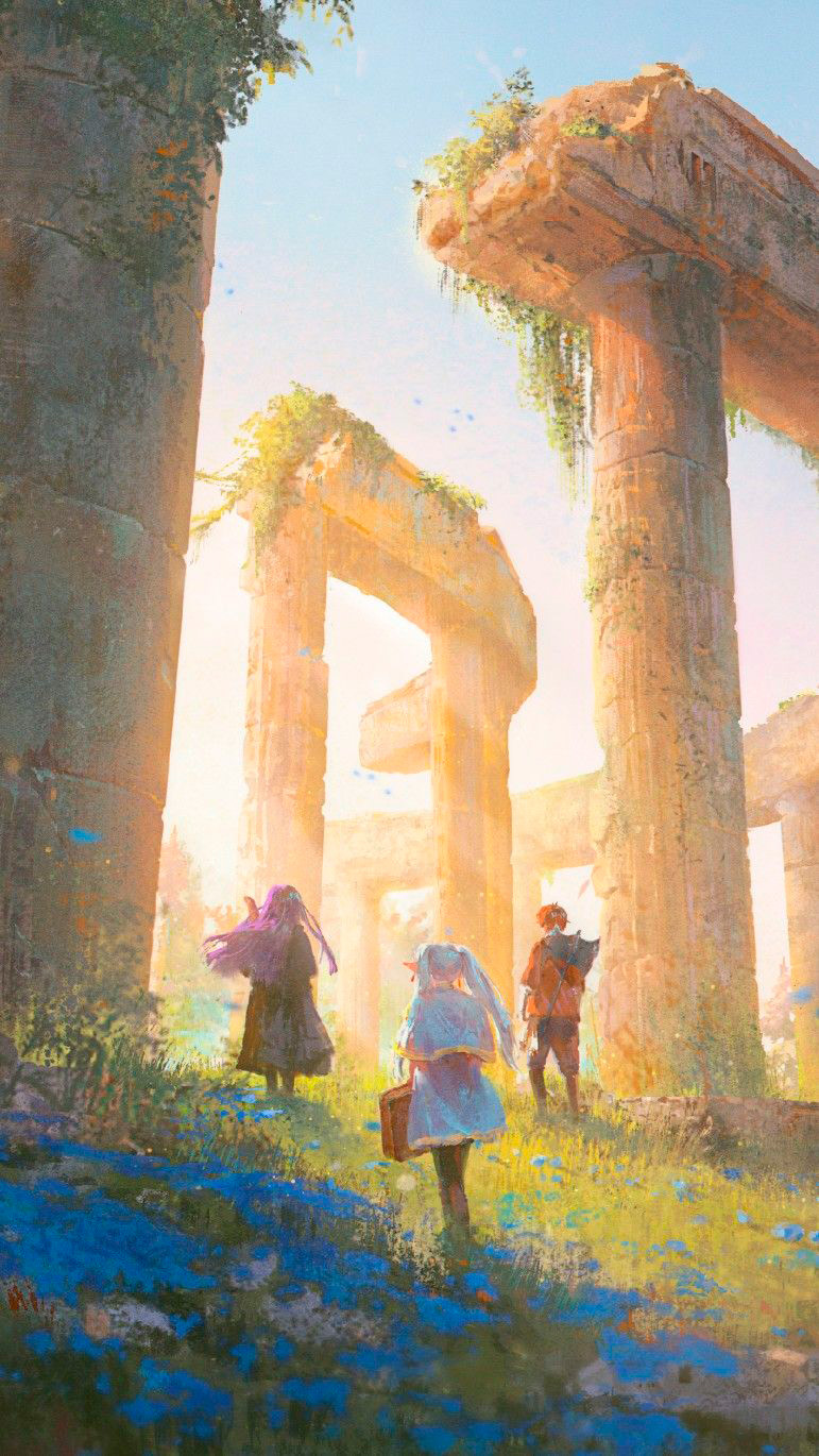 Frieren wallpaper, Beyond Journey's End, anime mobile wallpaper 4K, ancient ruins wallpaper, fantasy landscape, high resolution anime art, adventure anime wallpaper, ruins exploration, mobile phone wallpaper, vertical anime wallpaper