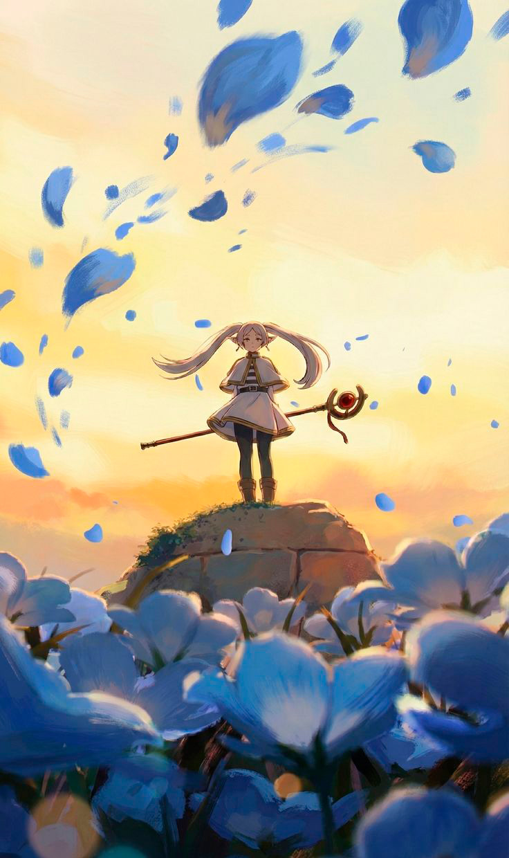 Frieren mobile wallpaper, anime wallpaper 4K, Beyond Journey's End, blue flowers wallpaper, high resolution anime, elf mage wallpaper, sunset anime scene, vertical wallpaper, phone wallpaper anime, flower field wallpaper