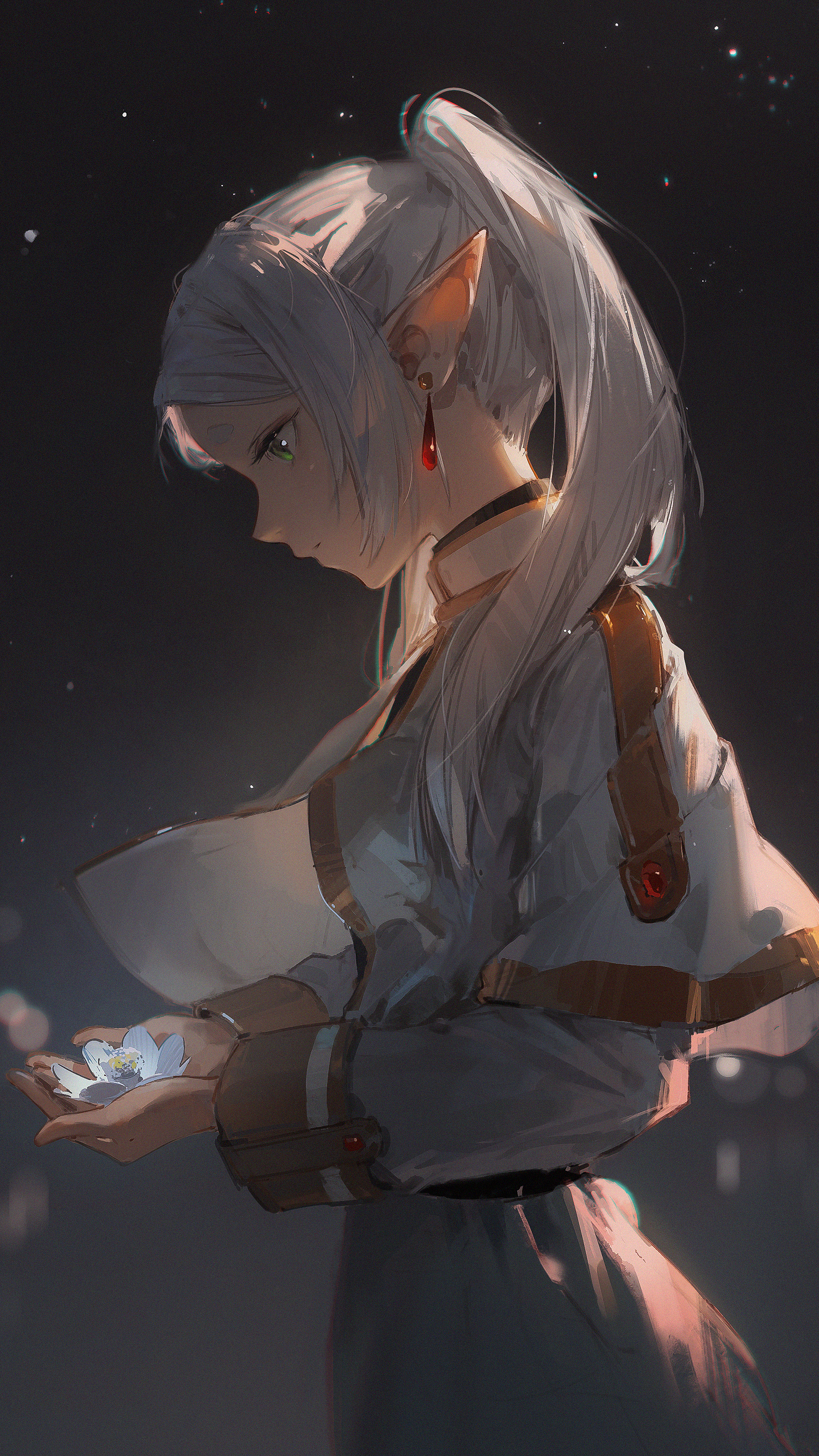 A stunning 4K digital artwork of Frieren, the silver-haired elf mage, gazing at a delicate white flower in her hands. Set against a dark, starry background, this high-resolution wallpaper captures her serene and melancholic beauty.
