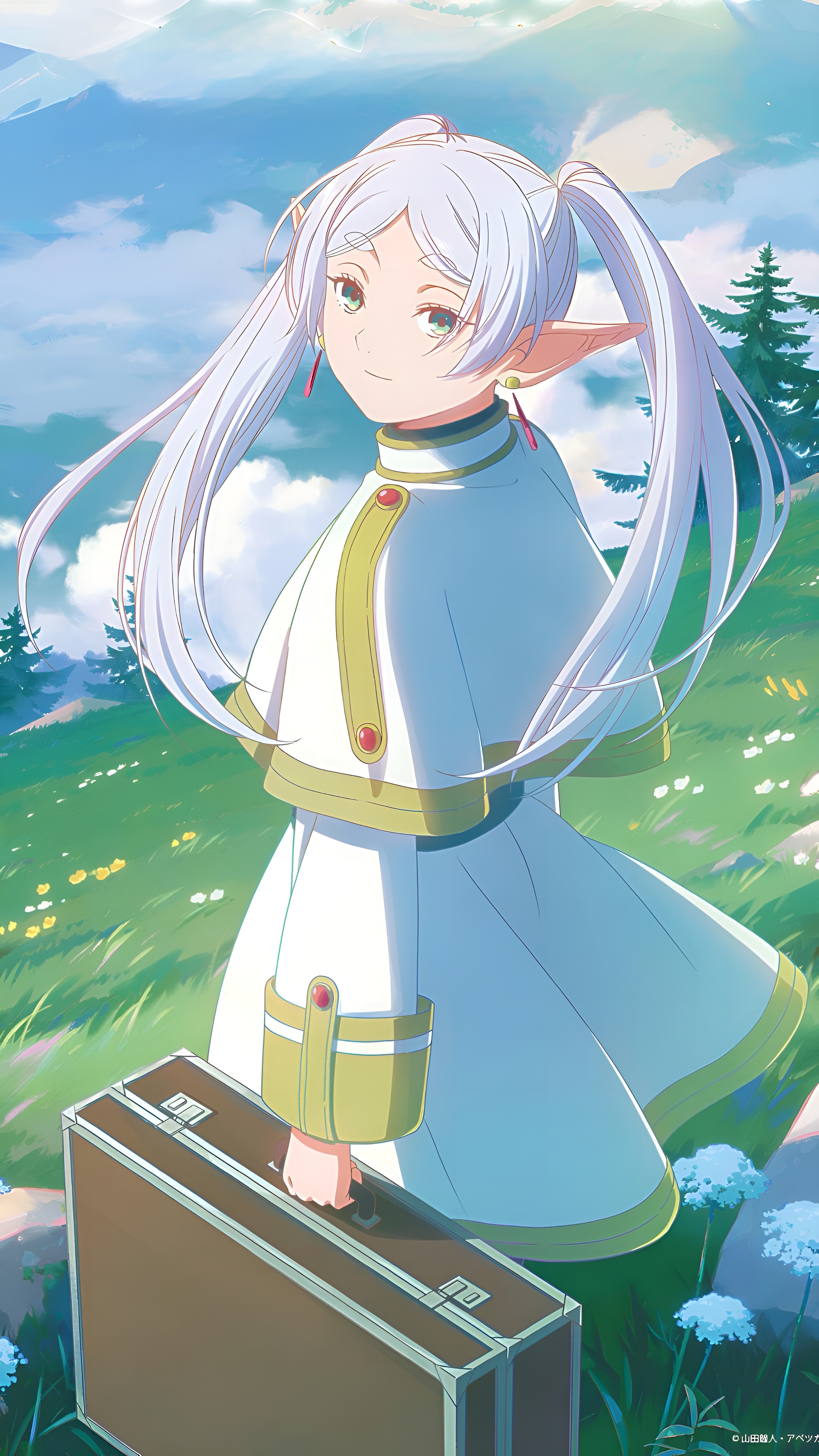 Frieren, the silver-haired elf mage from 'Frieren: Beyond Journey's End,' stands gracefully in a lush meadow holding a suitcase, wearing her iconic white and gold robe under a bright sky.
