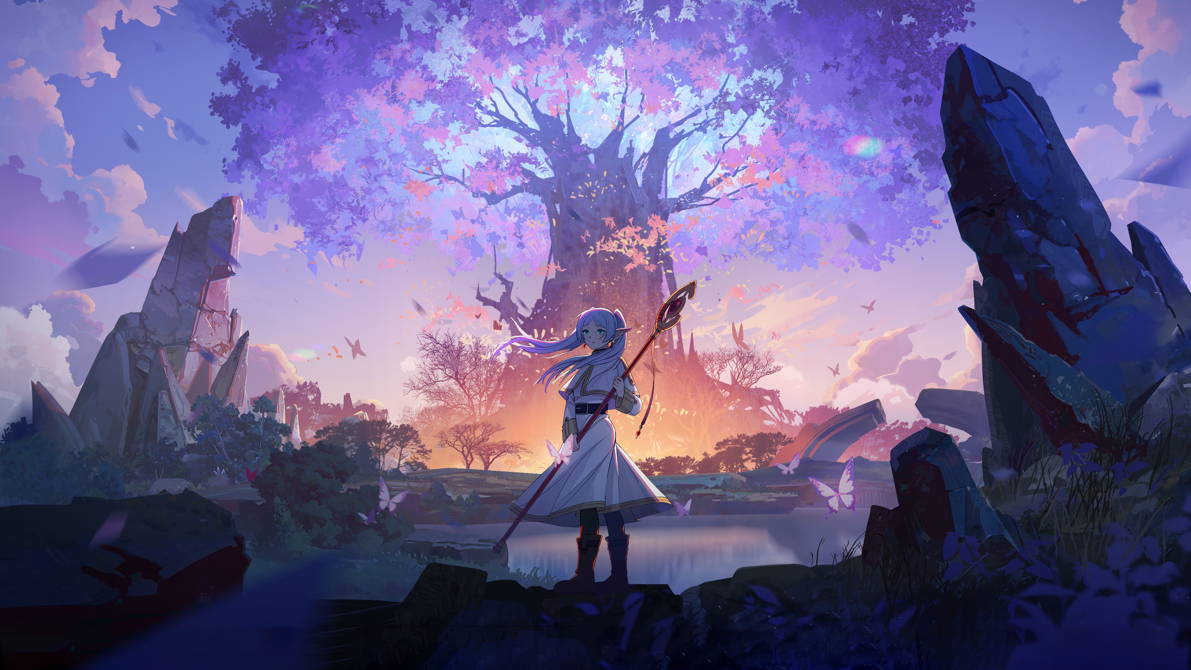 Frieren wallpaper, Frieren beyond journey's end, anime 4K wallpaper, fantasy landscape wallpaper, elf mage anime, ultra HD anime wallpaper, magical tree scenery, Frieren fan art, high resolution anime background, anime desktop wallpaper