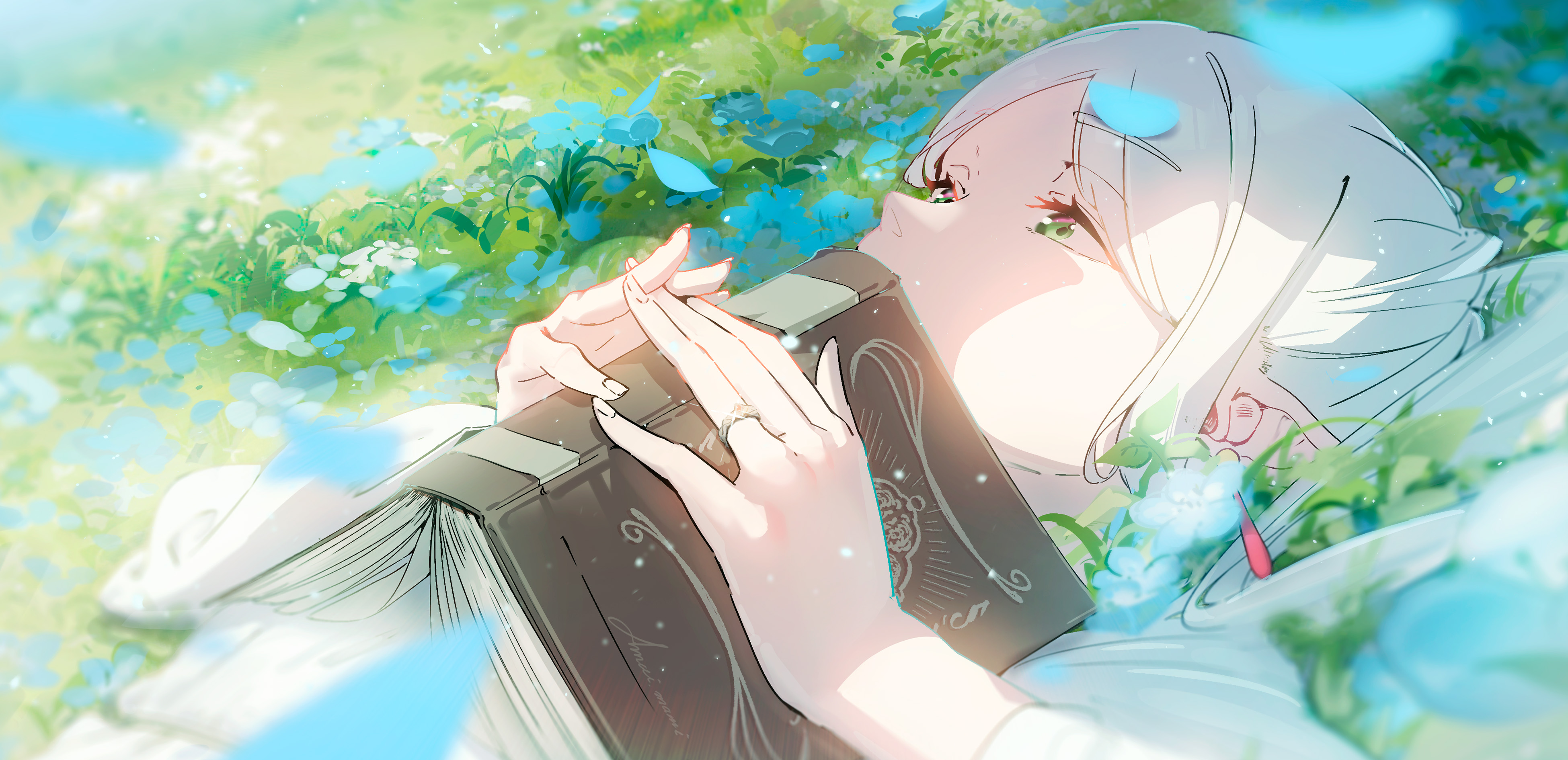 Stunning 4K anime wallpaper featuring Frieren from Beyond Journey's End lying peacefully in a vibrant flower field. The silver-haired elf mage gazes upward surrounded by lush blue and green blooms, creating a dreamy and serene atmosphere with beautiful lighting effects.