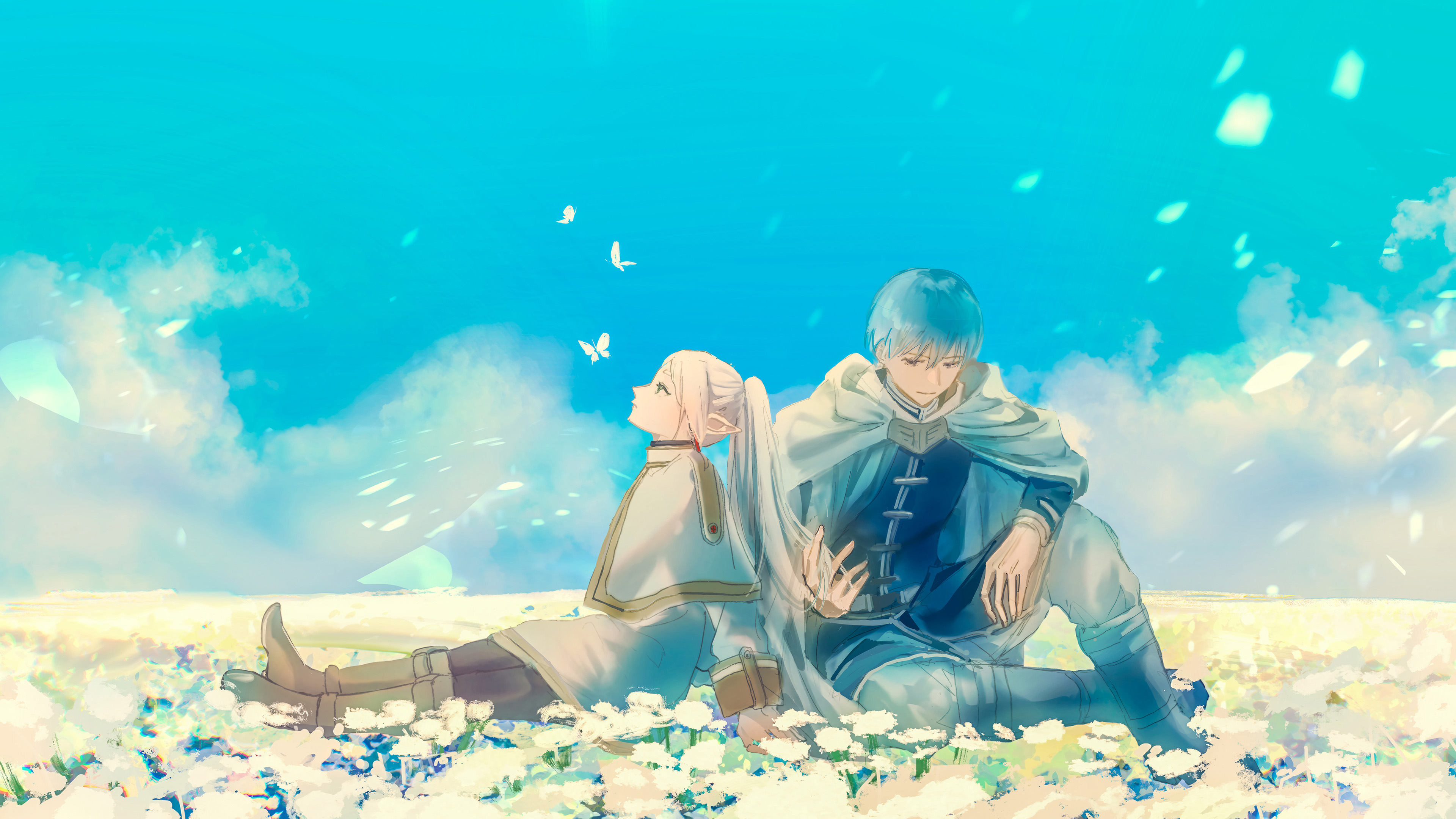 Frieren wallpaper, anime wallpaper 4K, Beyond Journey's End, flower field wallpaper, high resolution anime art, blue sky anime wallpaper, peaceful anime scene, elf mage wallpaper, ultra HD wallpaper, anime couple wallpaper
