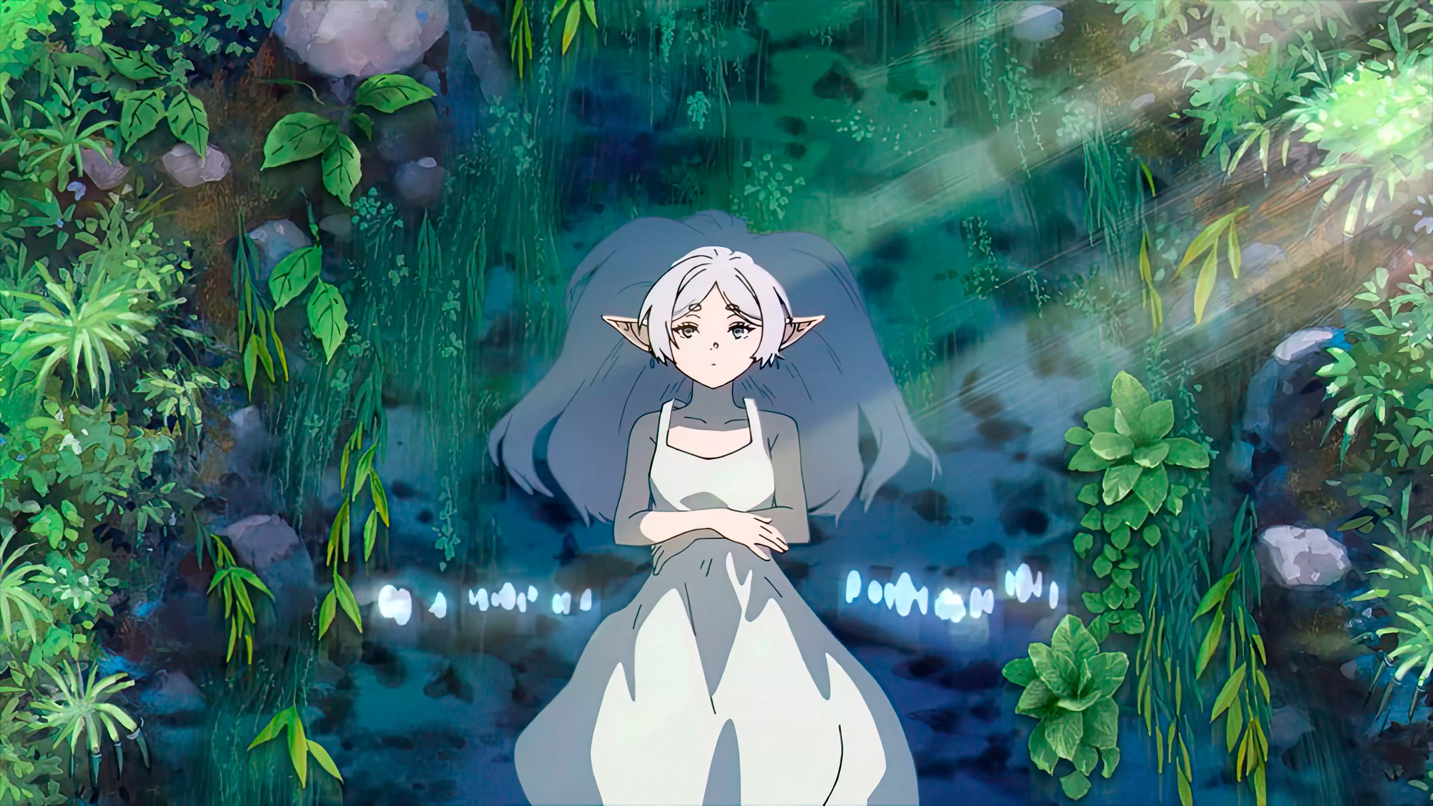 Frieren wallpaper, anime wallpaper 4K, Beyond Journey's End, forest anime wallpaper, waterfall wallpaper, elf mage, high resolution anime art, nature anime wallpaper, magical forest scene, ultra HD wallpaper