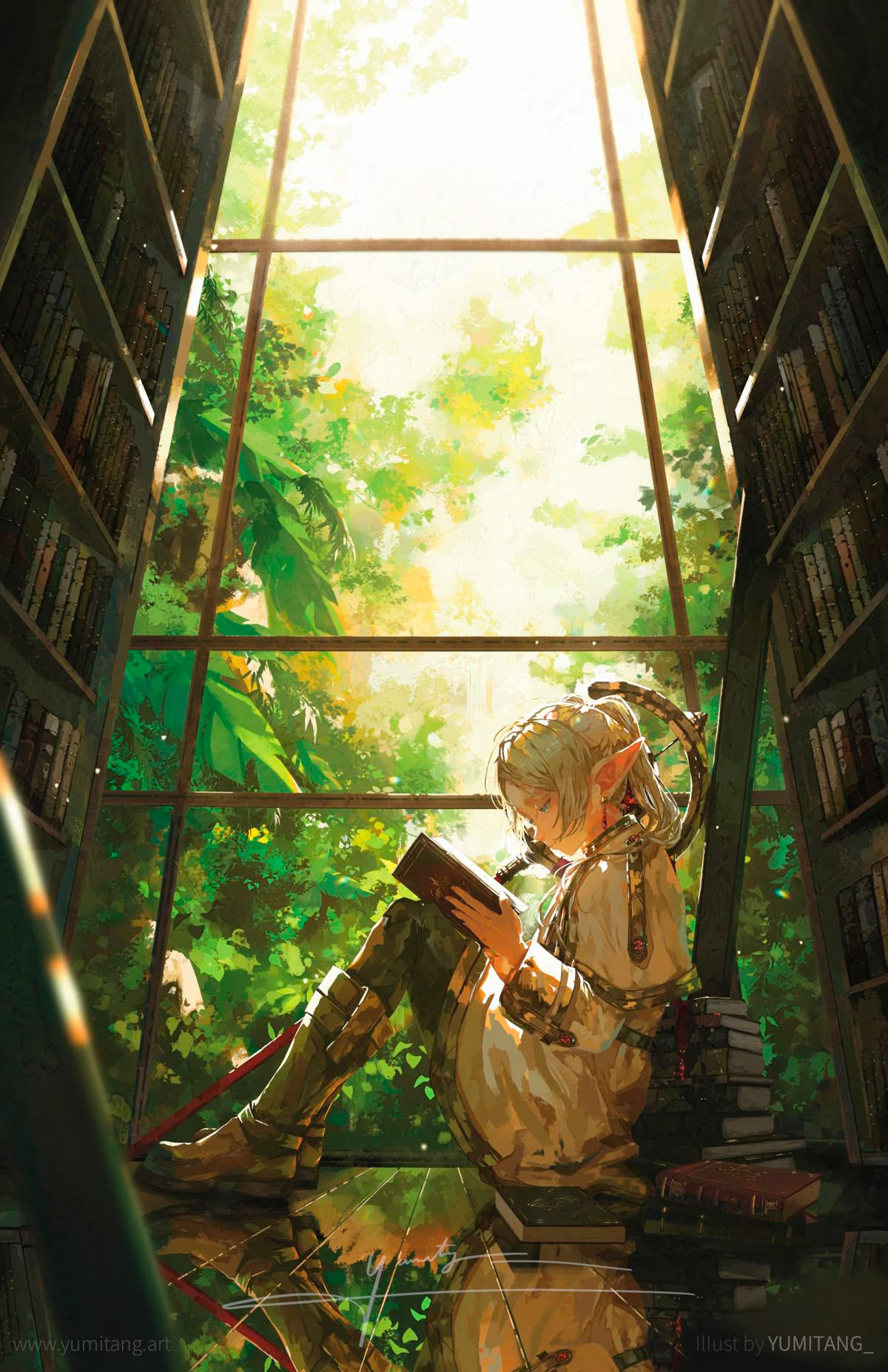 Frieren wallpaper, anime wallpaper 4K, Beyond Journey's End, library anime wallpaper, reading wallpaper, elf mage wallpaper, high resolution anime art, mobile wallpaper, bookshelf aesthetic, sunlight anime scene, vertical wallpaper