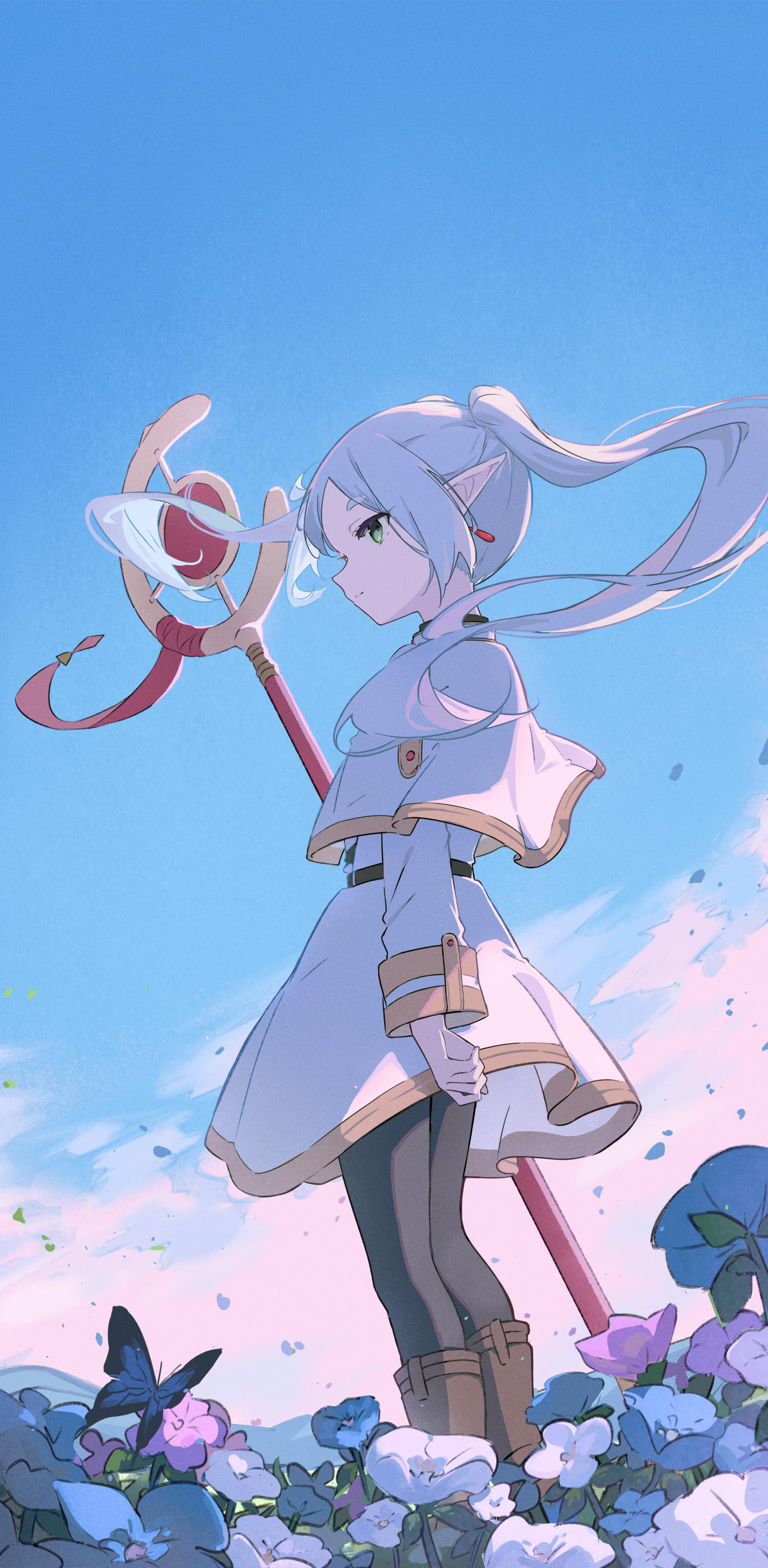Frieren stands gracefully in a blooming flower field, wielding her iconic magical staff beneath a serene blue sky. A butterfly rests nearby as petals drift through the wind in this stunning high-resolution artwork.