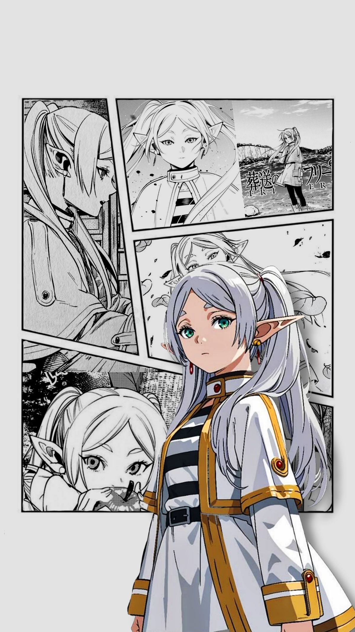 Frieren Beyond Journey's End, manga collage wallpaper, 4K anime wallpaper, Frieren manga panels, high resolution anime, elf mage wallpaper, anime character collage, ultra HD wallpaper