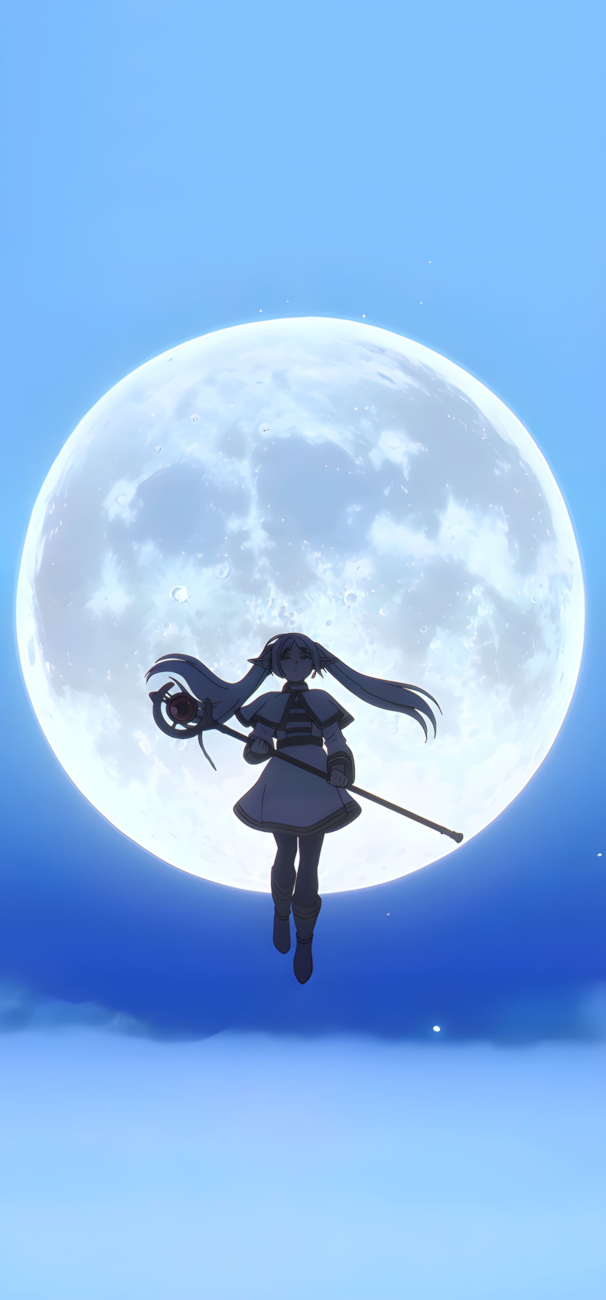 Stunning 4K wallpaper of Frieren floating before a massive full moon in a blue sky. The elven mage holds her staff with twin-tail hair flowing, creating a breathtaking high-resolution fantasy scene.
