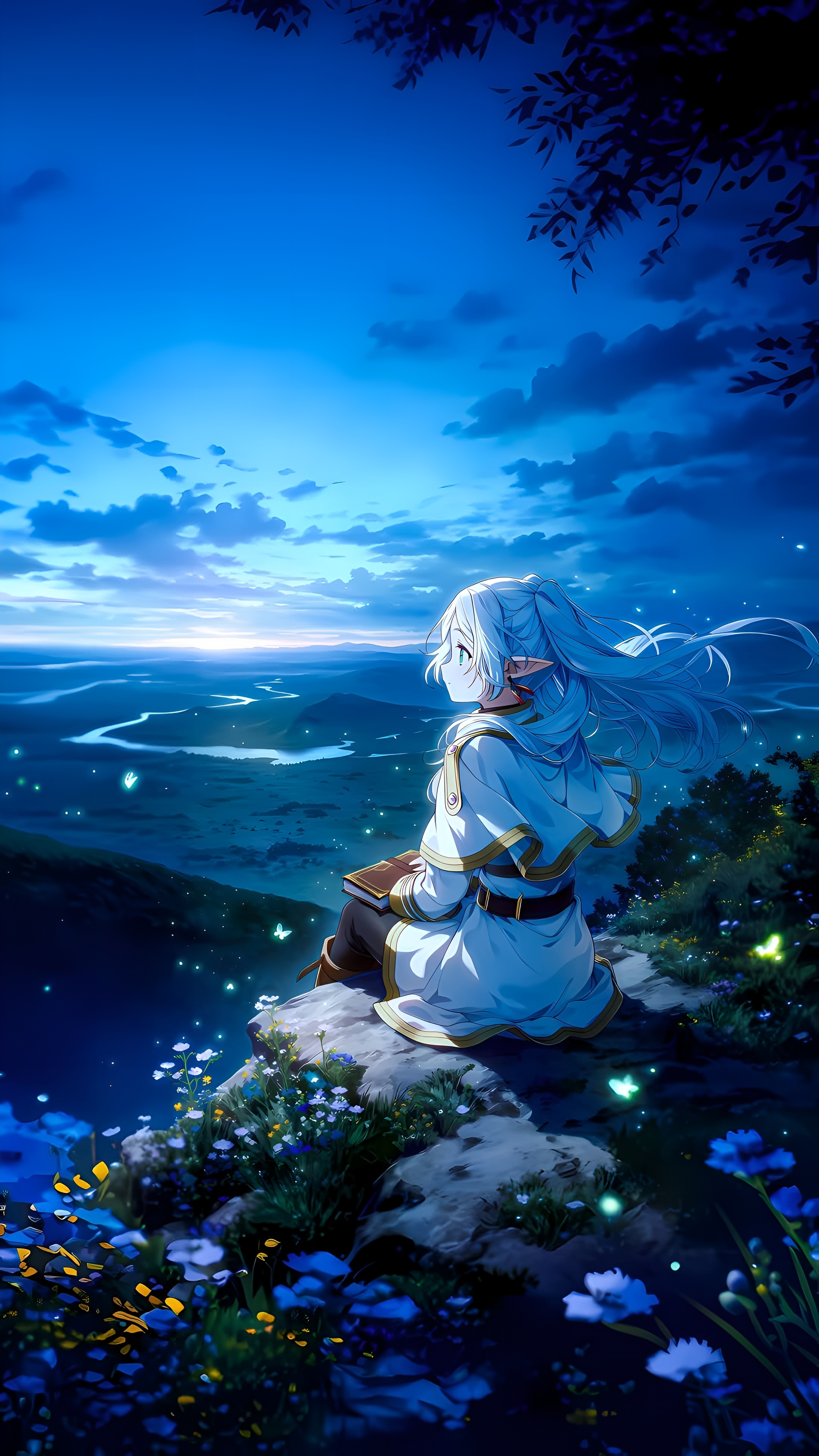 Frieren sits peacefully on a cliff's edge, gazing over a breathtaking moonlit valley. Glowing fireflies and wildflowers surround her as her silver hair flows in the wind, evoking a sense of timeless solitude and magic.