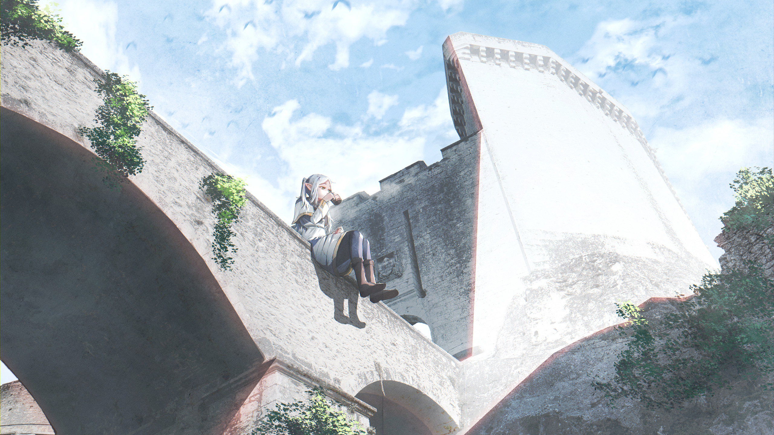 Frieren, the silver-haired elf mage, sits peacefully atop ancient stone ruins beneath a bright blue sky. Ivy-covered archways and crumbling towers frame this breathtaking fantasy scene in stunning 4K detail.
