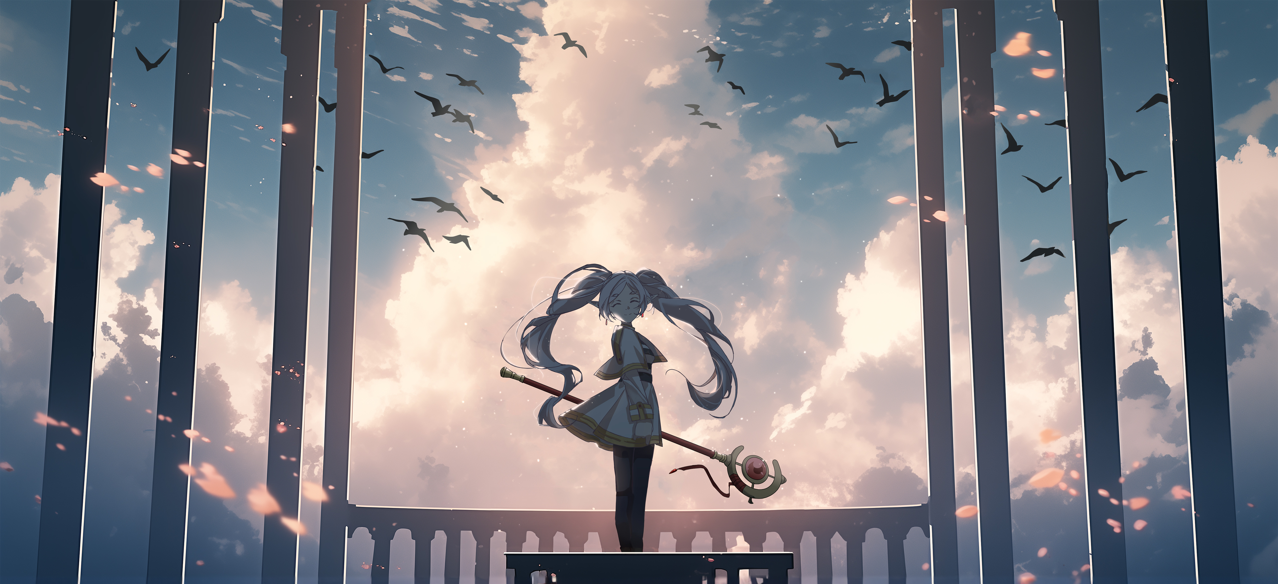 A breathtaking 4K anime wallpaper featuring Frieren standing on a grand balcony, wielding her magical staff amid swirling petals and soaring birds against a dramatic cloudscape sky.
