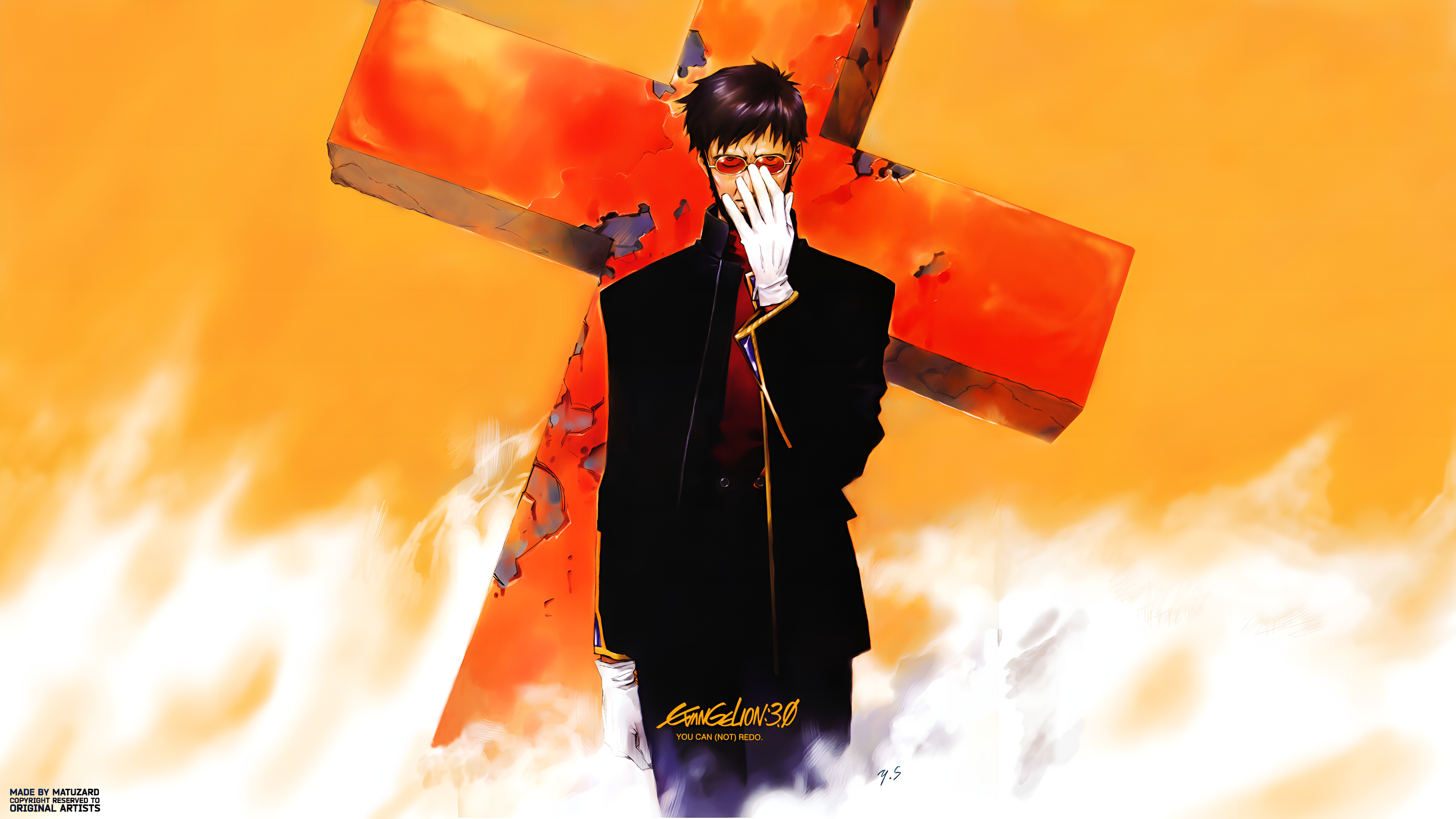 Stunning 4K fan art wallpaper of Gendo Ikari from Neon Genesis Evangelion 3.0: You Can (Not) Redo. Features the iconic commander standing before a fiery cross, wearing his signature black coat and red tinted glasses.