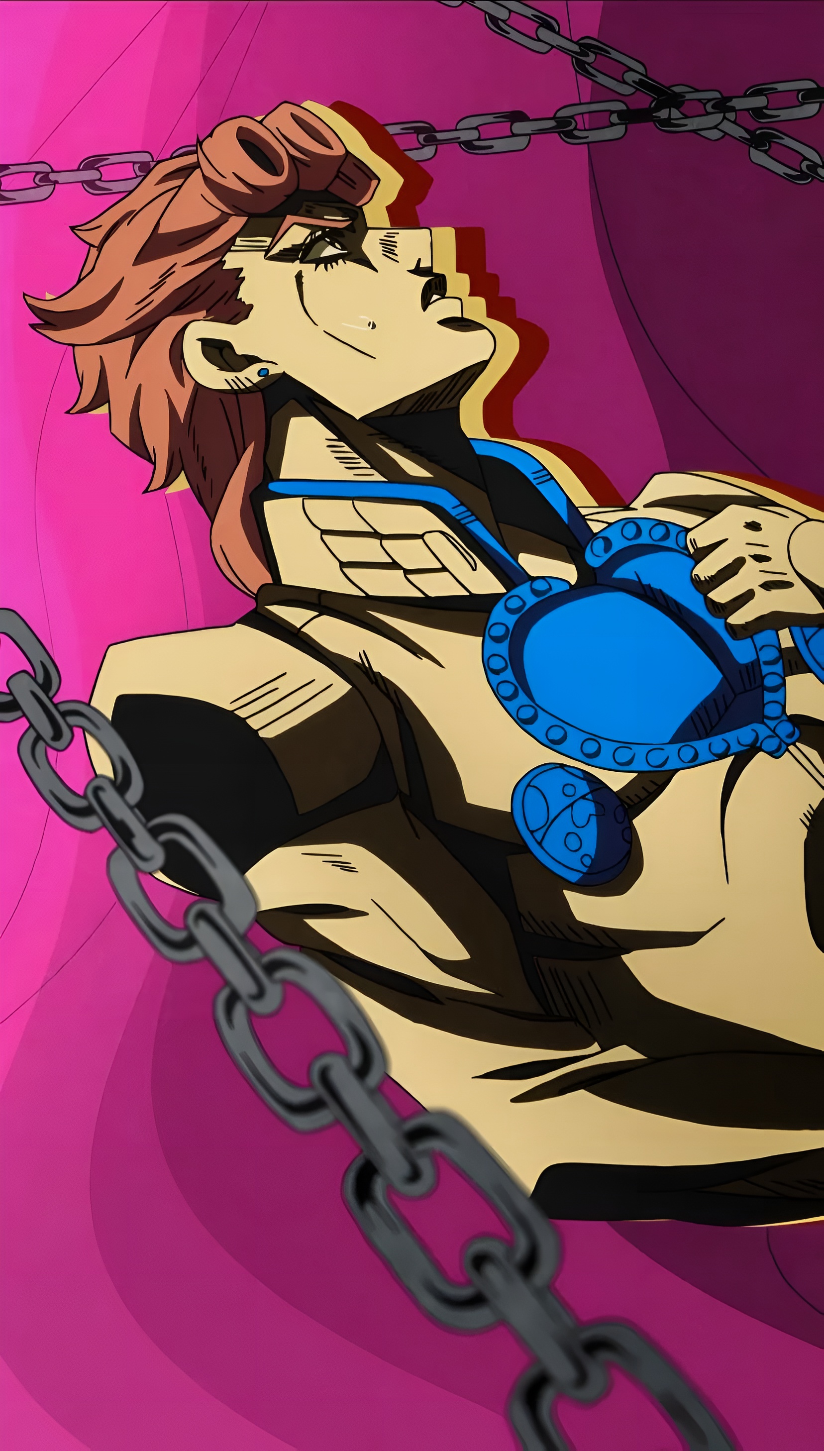Stunning 4K high-resolution wallpaper of Giorno Giovanna from JoJo's Bizarre Adventure, depicted in chains against a vibrant magenta background, holding his iconic Stand arrow with dramatic anime art style.