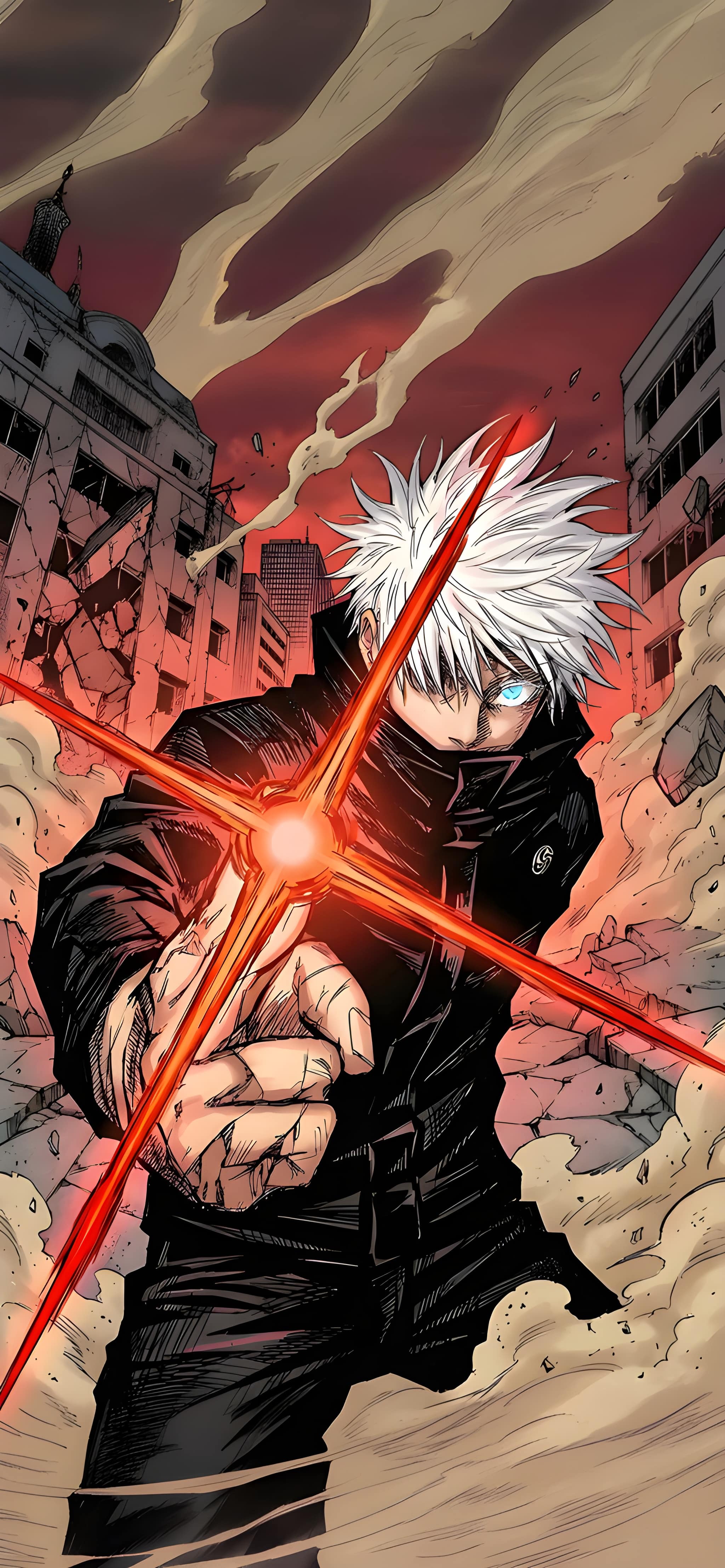 Stunning 4K wallpaper of Gojo Satoru from Jujutsu Kaisen, featuring his iconic white hair and blue eyes, wielding a glowing red cross energy attack amid a devastated cityscape with dramatic red skies.