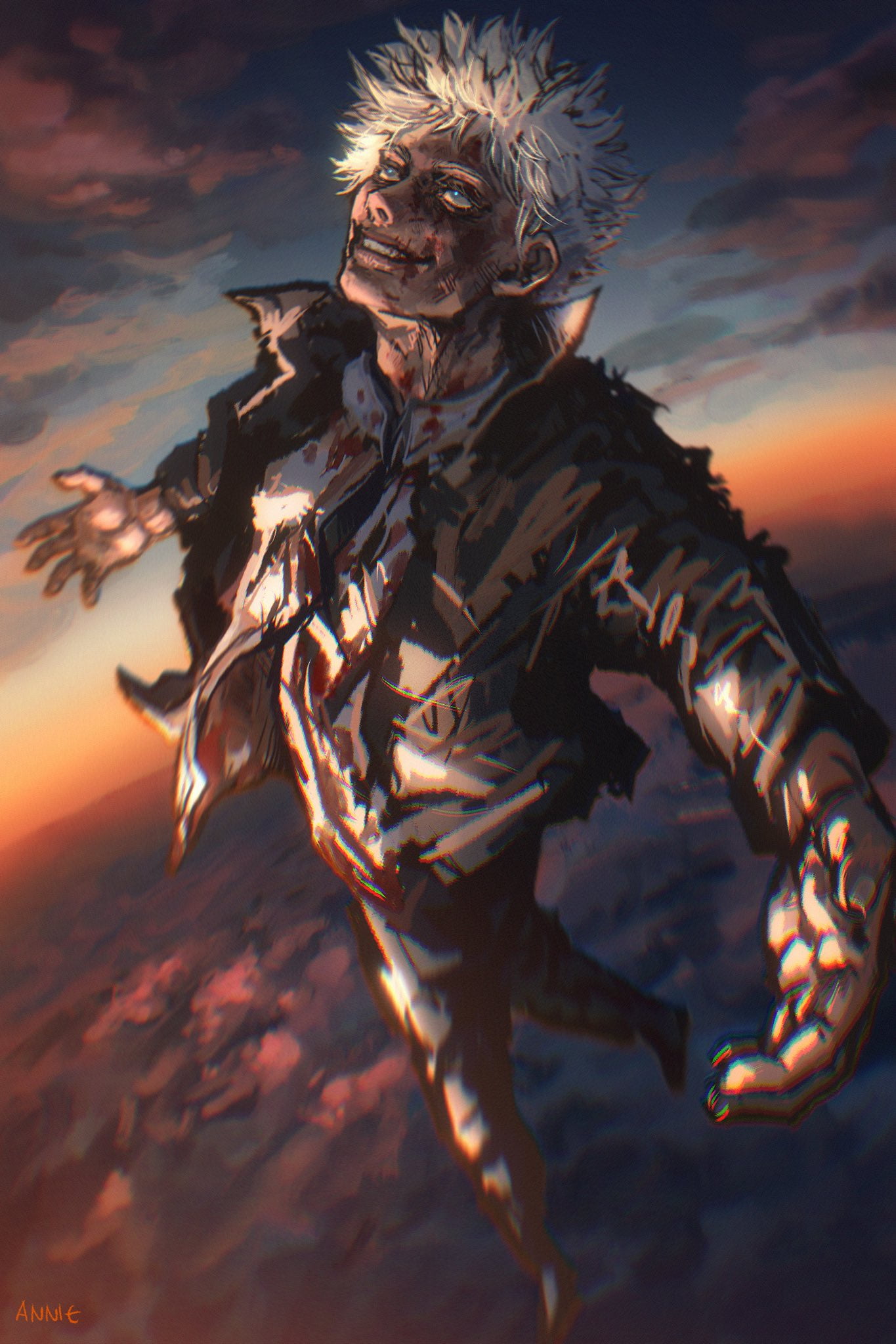 Stunning 4K digital fan art wallpaper of Satoru Gojo from Jujutsu Kaisen, depicted battered and bloodied against a dramatic sunset sky, showcasing raw power and resilience in ultra-high resolution detail.