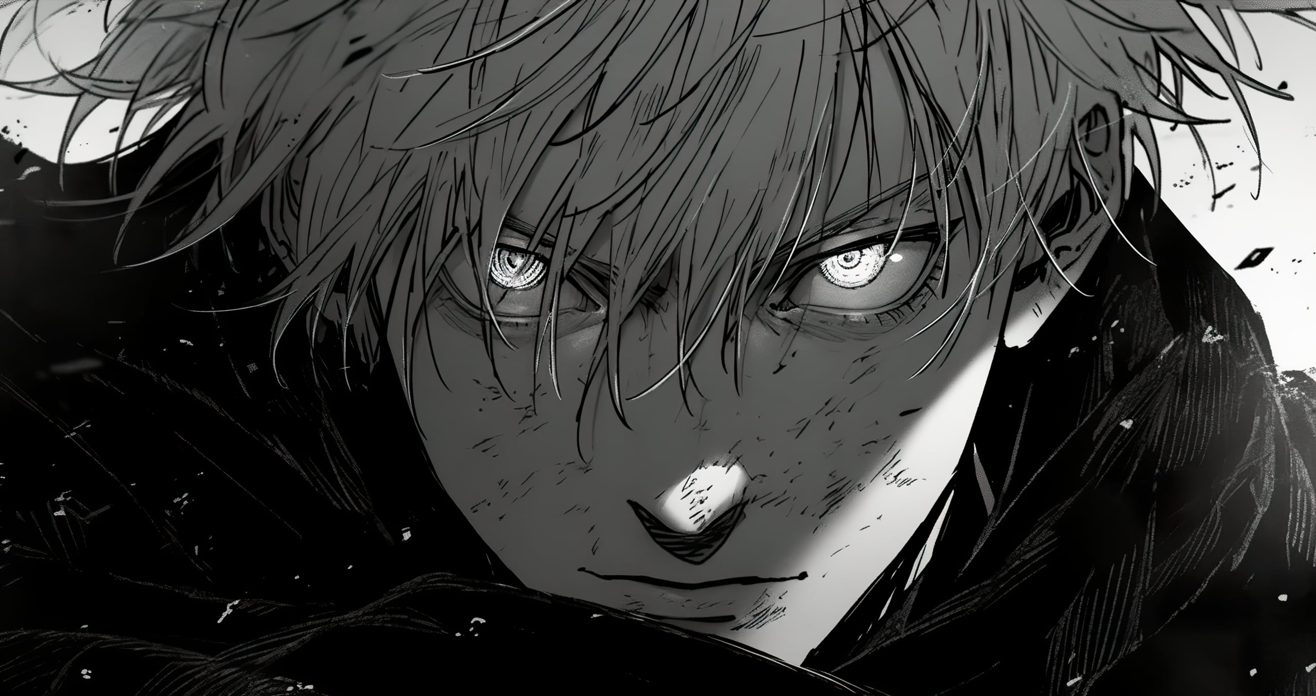 Jujutsu Kaisen wallpaper, Gojo Satoru 4K, anime manga wallpaper, black and white anime art, high resolution anime wallpaper, JJK Gojo closeup, dark anime aesthetic, manga illustration 4K
