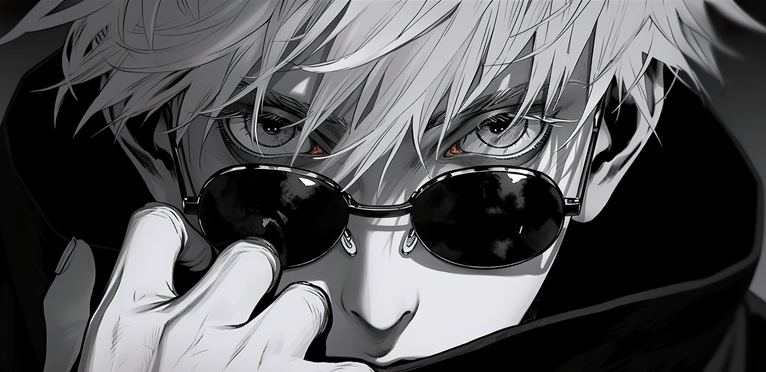Stunning 4K high-resolution Jujutsu Kaisen wallpaper featuring Gojo Satoru lowering his iconic sunglasses, revealing his piercing eyes. Dark, dramatic monochrome art style with exceptional detail and cinematic composition.