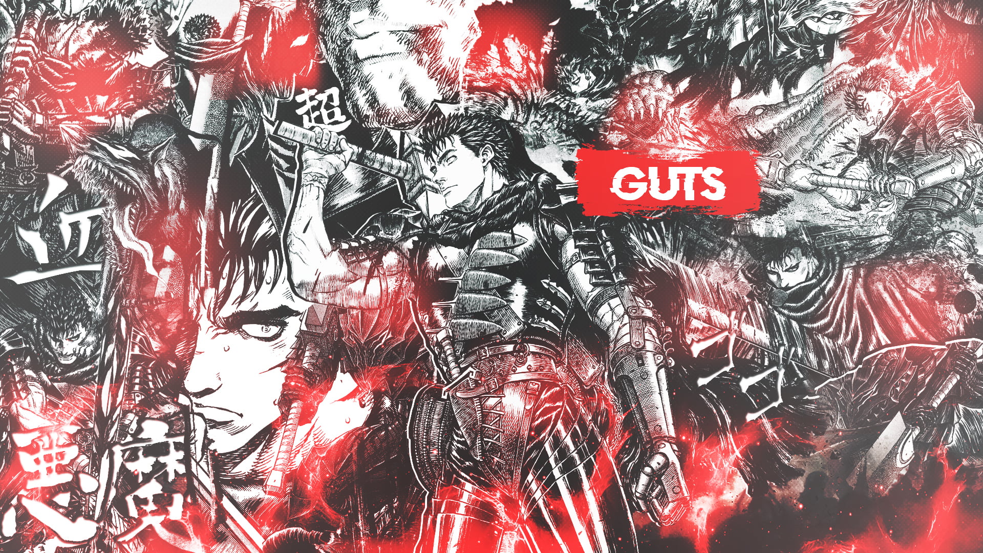 Stunning 4K high-resolution Berserk wallpaper featuring Guts in his iconic Black Swordsman armor, surrounded by intense red and black manga artwork collage with dramatic battle scenes and Japanese kanji.