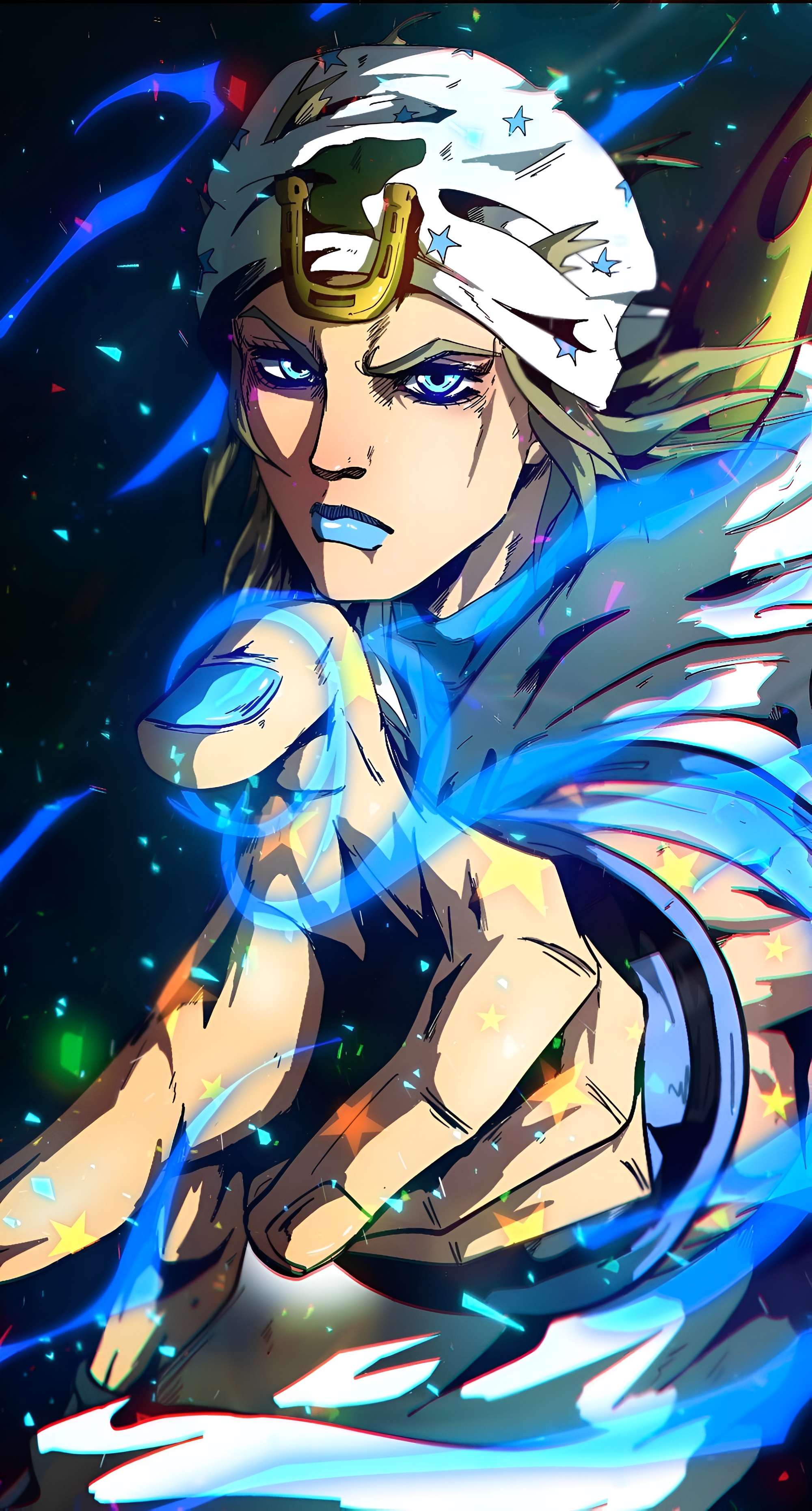 Stunning 4K high-resolution anime wallpaper featuring Gyro Zeppeli from JoJo's Bizarre Adventure: Steel Ball Run. Dynamic artwork showcasing his iconic white hat, golden horseshoe, piercing blue eyes, and swirling Stand energy.