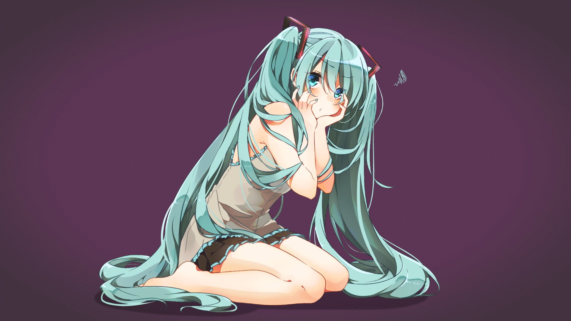 Stunning 4K high-resolution wallpaper featuring Hatsune Miku sitting gracefully with her iconic long teal twin-tails. Beautiful anime art with a purple background, showcasing detailed illustration and vibrant colors perfect for desktop.