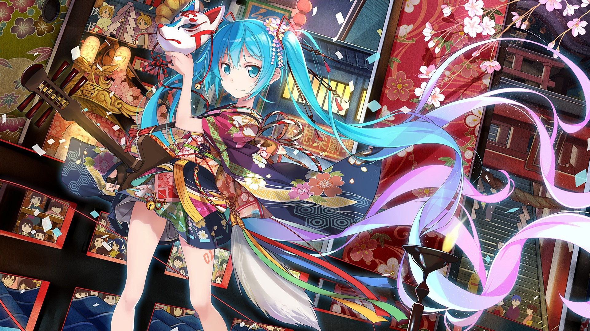 Hatsune Miku wallpaper, anime 4K wallpaper, Vocaloid kimono, Japanese festival anime, kitsune mask Miku, HD anime wallpaper, Miku Hatsune art, anime girl kimono, cherry blossom anime