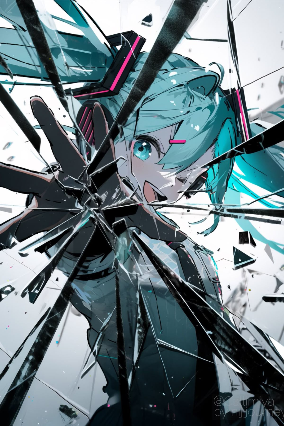 Hatsune Miku wallpaper, 4K anime wallpaper, shattered glass art, Vocaloid HD wallpaper, cyberpunk anime, teal hair anime girl, high resolution anime art, Miku digital art, anime glass break effect, ultra HD wallpaper