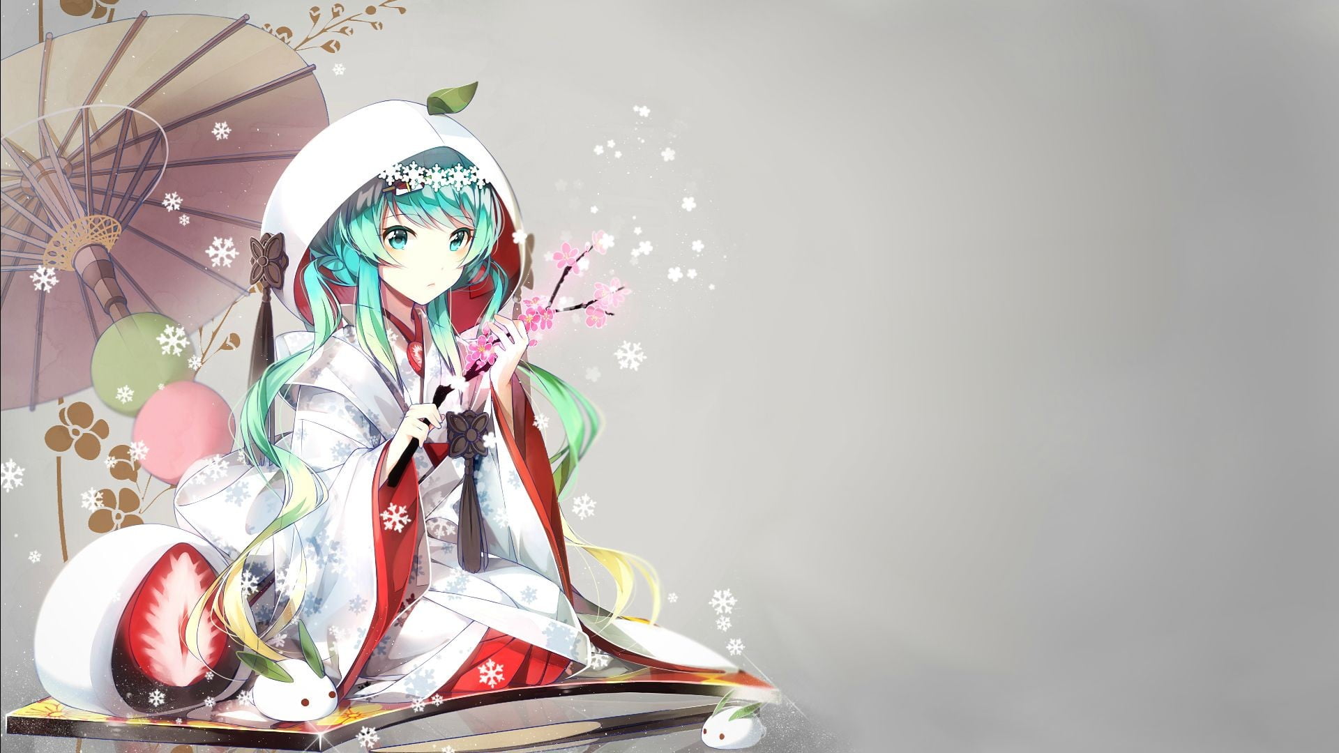 Hatsune Miku dressed in a stunning white and red kimono with snowflake patterns, holding cherry blossoms, surrounded by Japanese umbrellas and white rabbits in a beautiful winter-themed anime artwork.