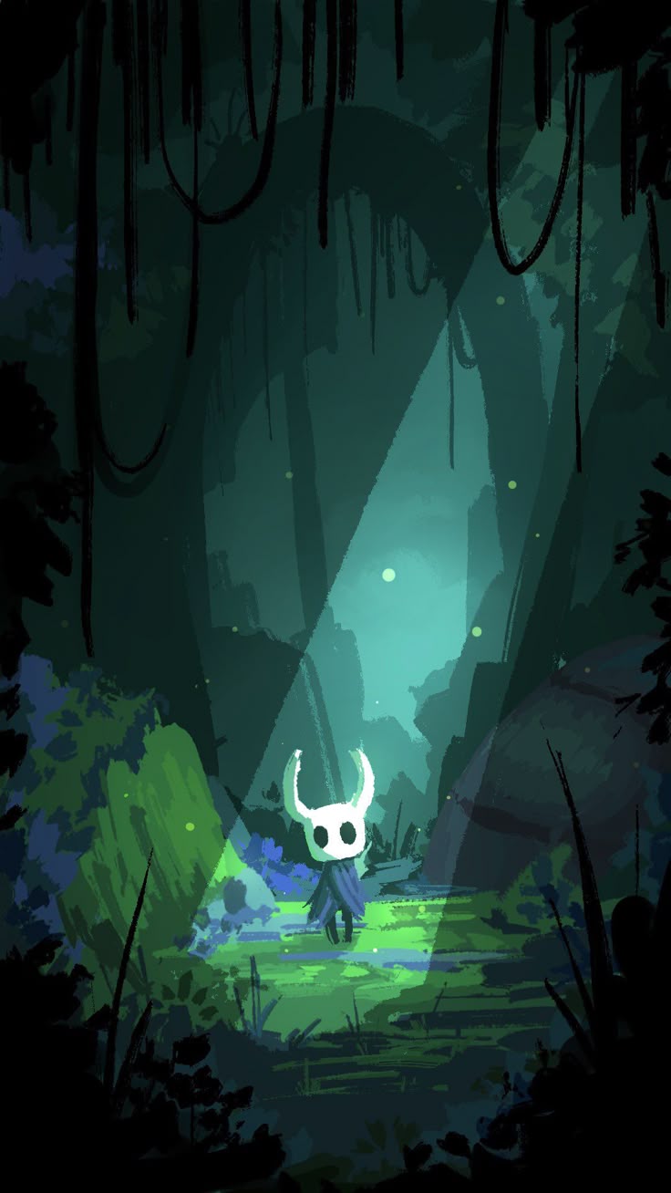 The Knight stands alone in a glowing, mysterious underground forest in Hallownest. Lush green tones and ethereal light create a hauntingly beautiful atmosphere, perfectly capturing Hollow Knight's iconic dark fantasy art style.