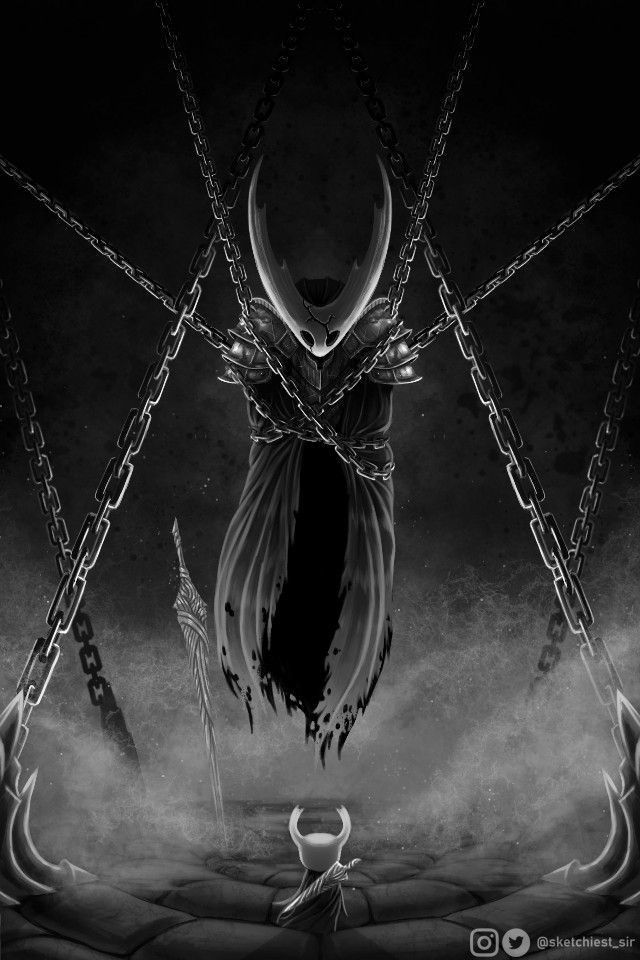 Hollow Knight wallpaper, 4K dark fantasy art, chained Hollow Knight, Hollow Knight fan art, monochrome game wallpaper, Hollow Knight boss, dark atmospheric art, high resolution gaming wallpaper, Hollow Knight protagonist, sketchiest_sir art